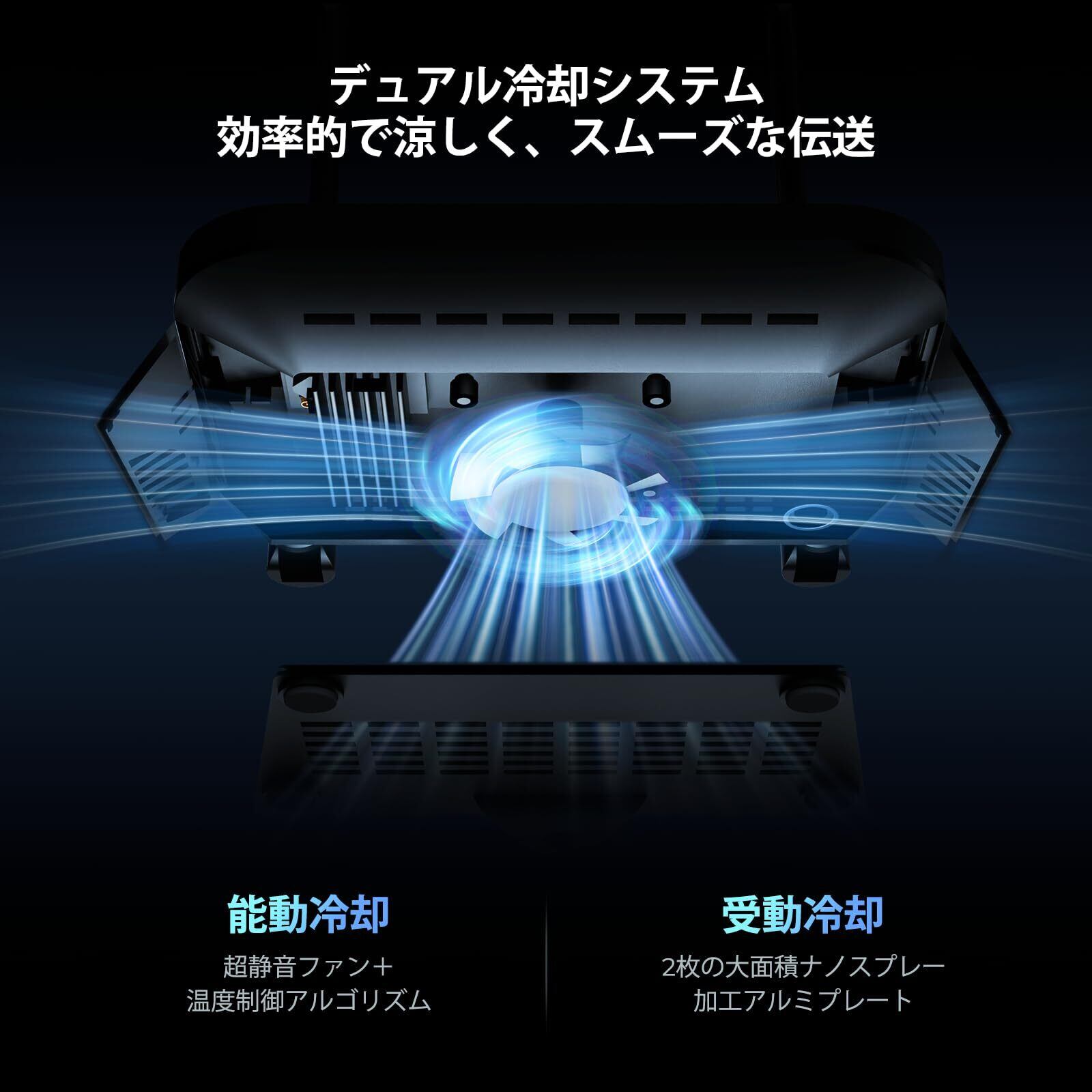 アクティブ + パッシブ デュアル冷却システム: アクティブ冷却は、温度制御アルゴリズムと組み合わせた超静音ファンを備えています。パッシブ冷却は、2 つの大きなナノスプレー アルミニウム プレートを使用します。デュアル システムにより、効率的でスムーズな伝送がされ、デバイスの寿命が延びます。