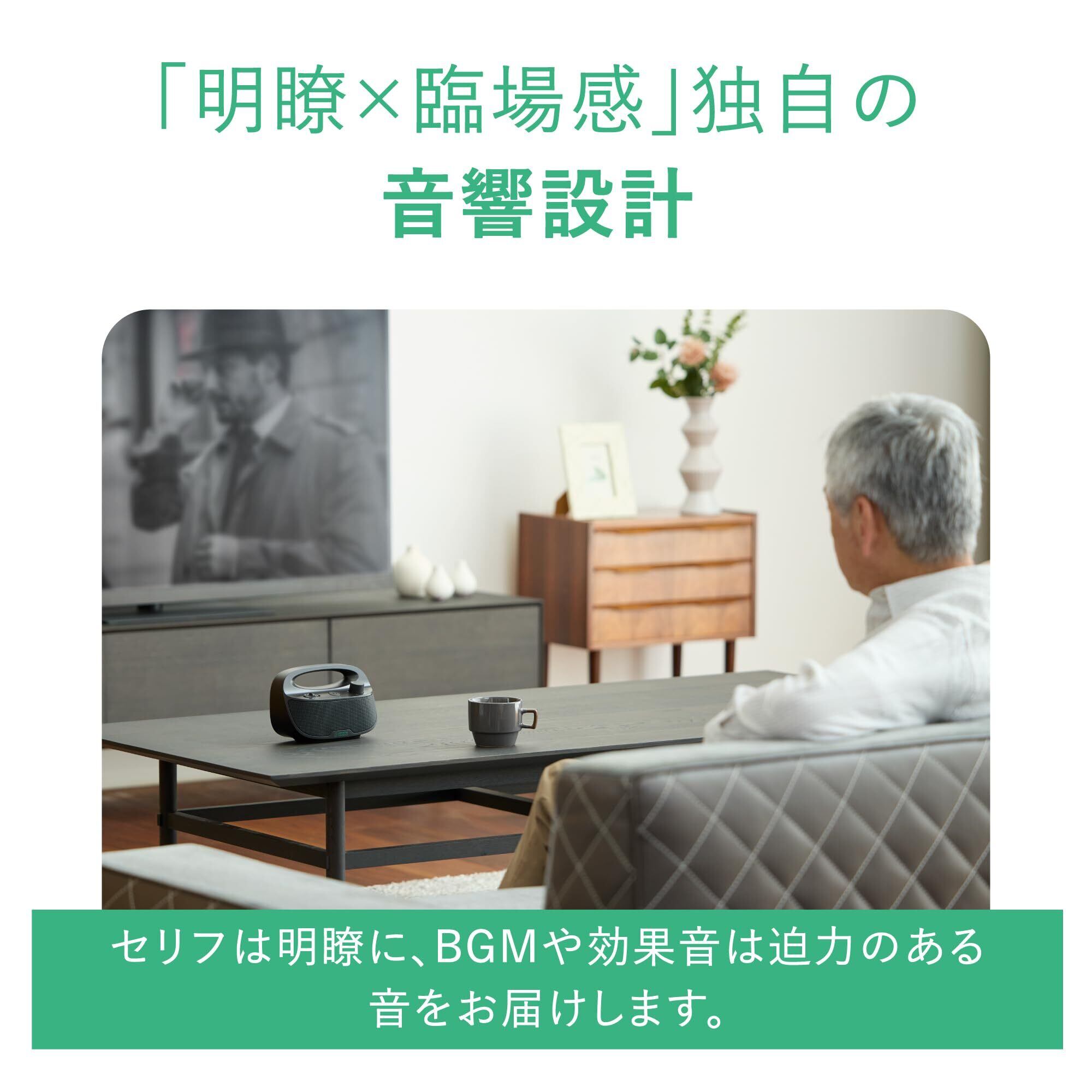 【誰でも、かんたん操作】 スピーカーの操作は、電源ボタン/ボリュームノブ/はっきり音スイッチとシンプルな設計。電源を「入れる」、音量を「調整する」、はっきり音を「設定する」の3ステップで、迷うことなく直感的に使えます。