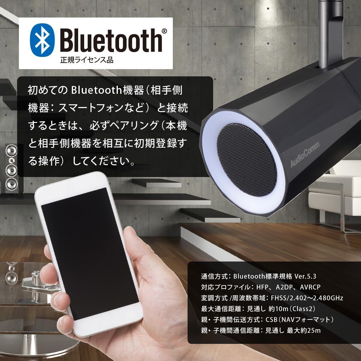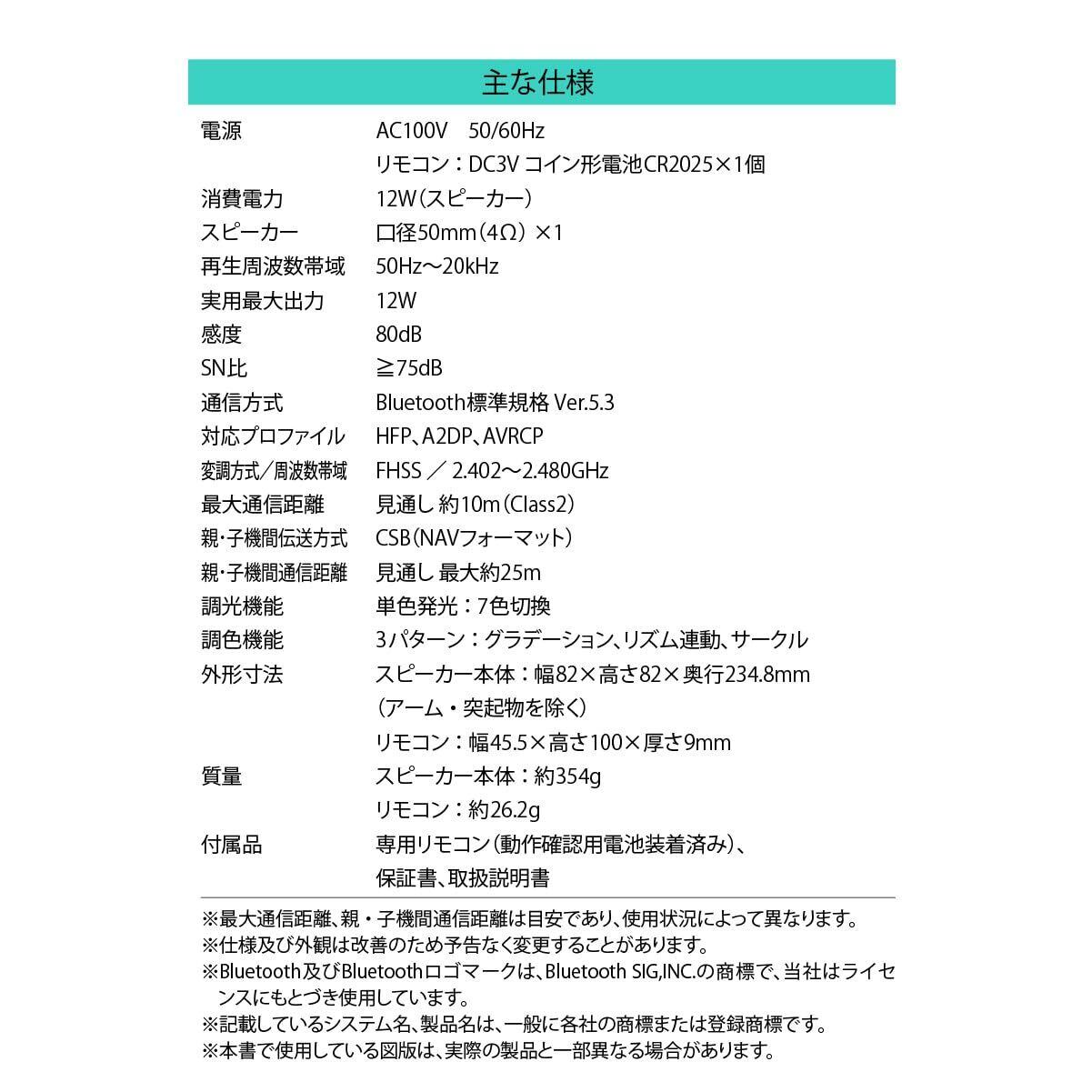 ◆対応プロファイル:HFP、A2DP、AVRCP ◆変調方式/周波数帯域:FHSS/2.402~2.480GHz ◆最大通信距離:見通し 約10m(Class2) ◆親・子機間伝送方式:CSB(NAVフォーマット) ◆親・子機間通信距離:見通し 最大約25m ◆調光機能:単色発光…7色切換 ◆調色機能:3パターン…グラデーション、リズム連動、サークル