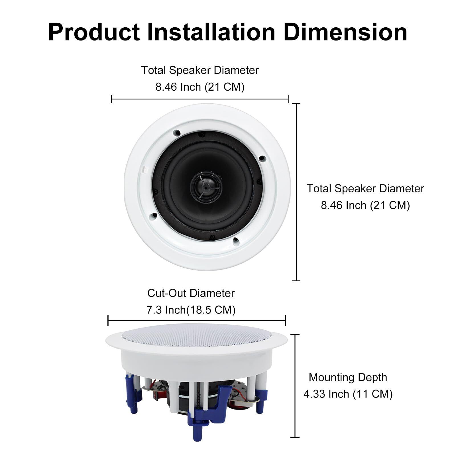 壁/天井への取り付け:スピーカーの合計直径8.46インチ(21.5 CM)、カットアウト直径7.3インチ(18.5 CM)、スピーカーの奥行き:4.33インチ(11 CM)