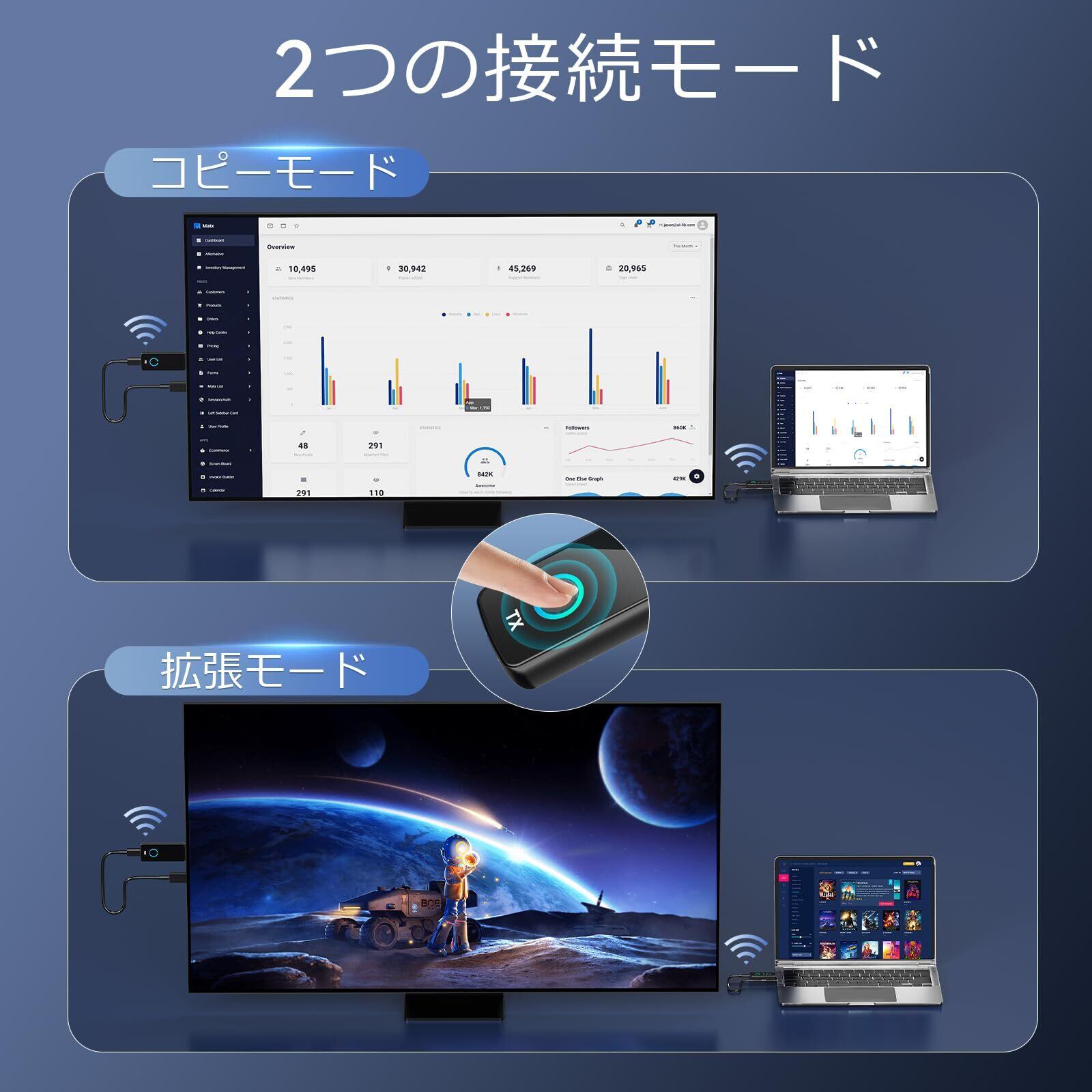 ■【マルチバンド対応の安定性!】5Gと2.4Gの2つの無線帯域を利用できるため、混雑した環境でも安定した映像と音声を楽しむことができます。家庭でもビジネスシーンでも、柔軟に対応できる設計です。