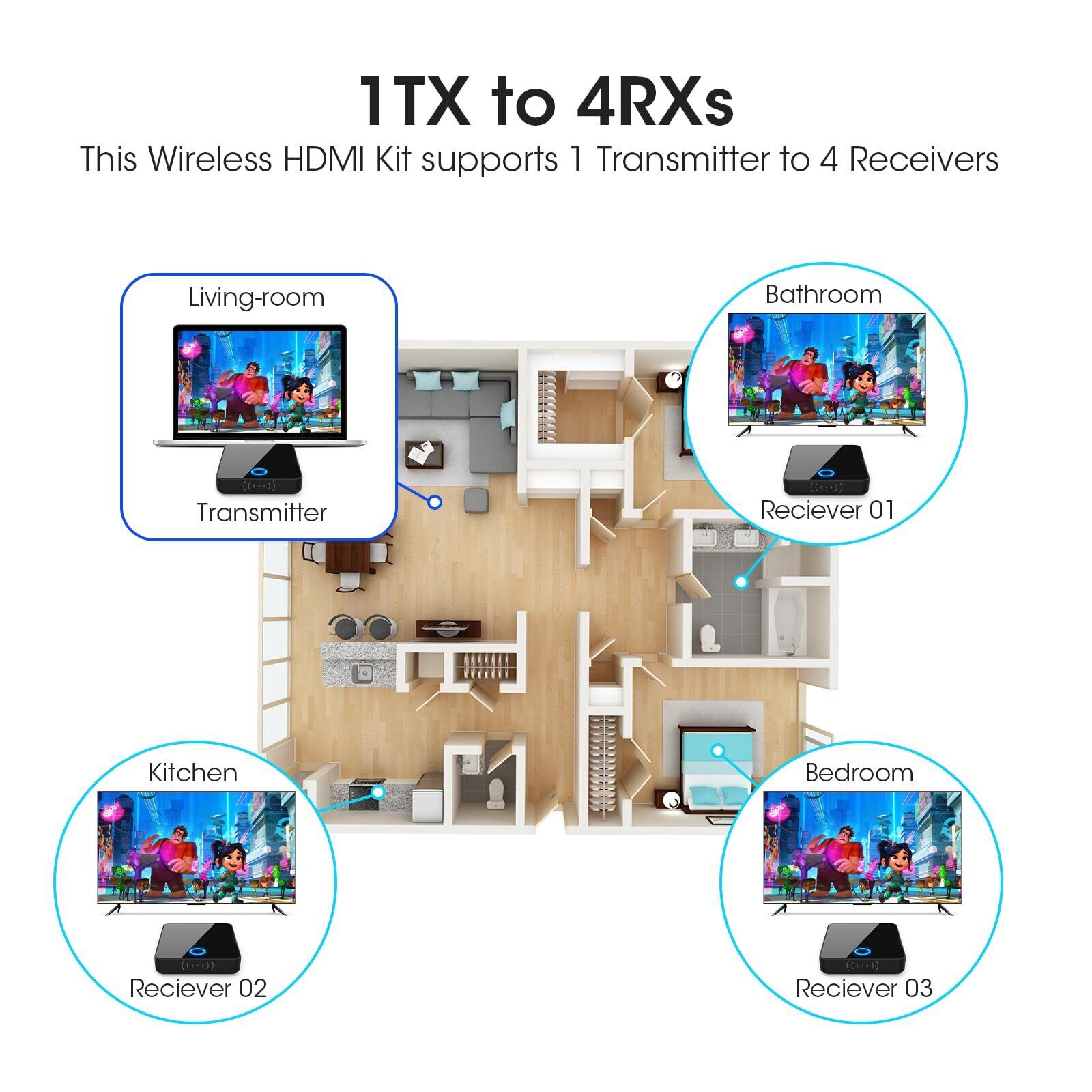 【98 Ft/30 M遠隔無線伝送】-2.4 G/5 G伝送プロトコルは、信号がより強く安定しており、伝送範囲は98 Ft/30メートルの視距離に達することができる。寝室のテレビでオンラインビデオを見ることができますが、別の部屋のセットボックスからの信号を受信します。マルチカメラプロジェクトや遠隔監視にも適しています。