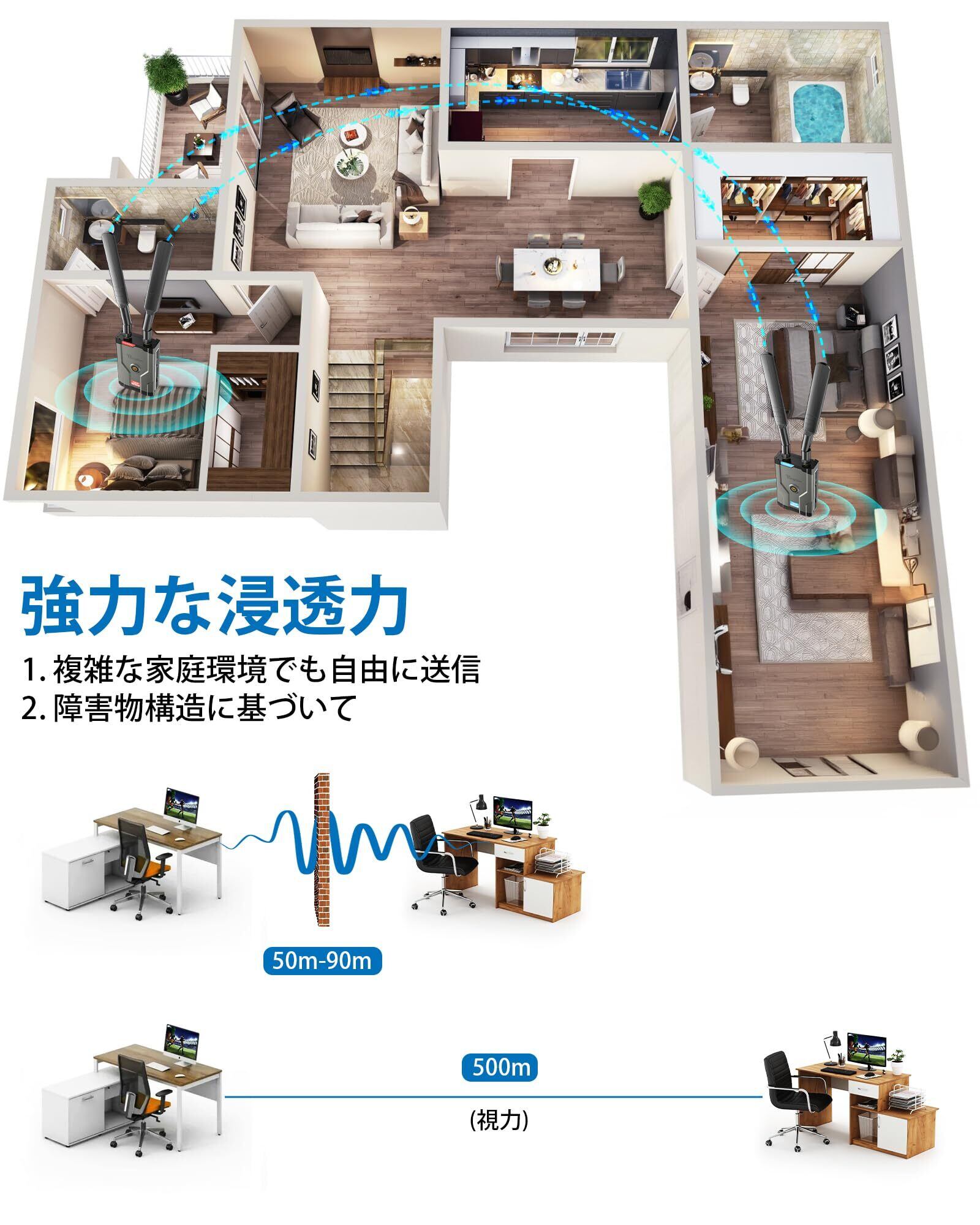 【最大500Mの伝送範囲】ワイヤレスHDMIは5GHzデュアルアンテナ技術で設計されており、強力な信号ブロードキャストと長距離伝送を提供します、1080PフルHD HDMI信号をワイヤレスで送信できます。オープンな会場で 500 メートルまで延長して干渉なしで最高の信号を維持します (注: 壁、レンガ、またはガラスがあると、ワイヤレス HDMI トランスミッターおよびレシーバー キットの信号範囲が狭くなったり、重大な信号損失が発生したりする可能性があります)
