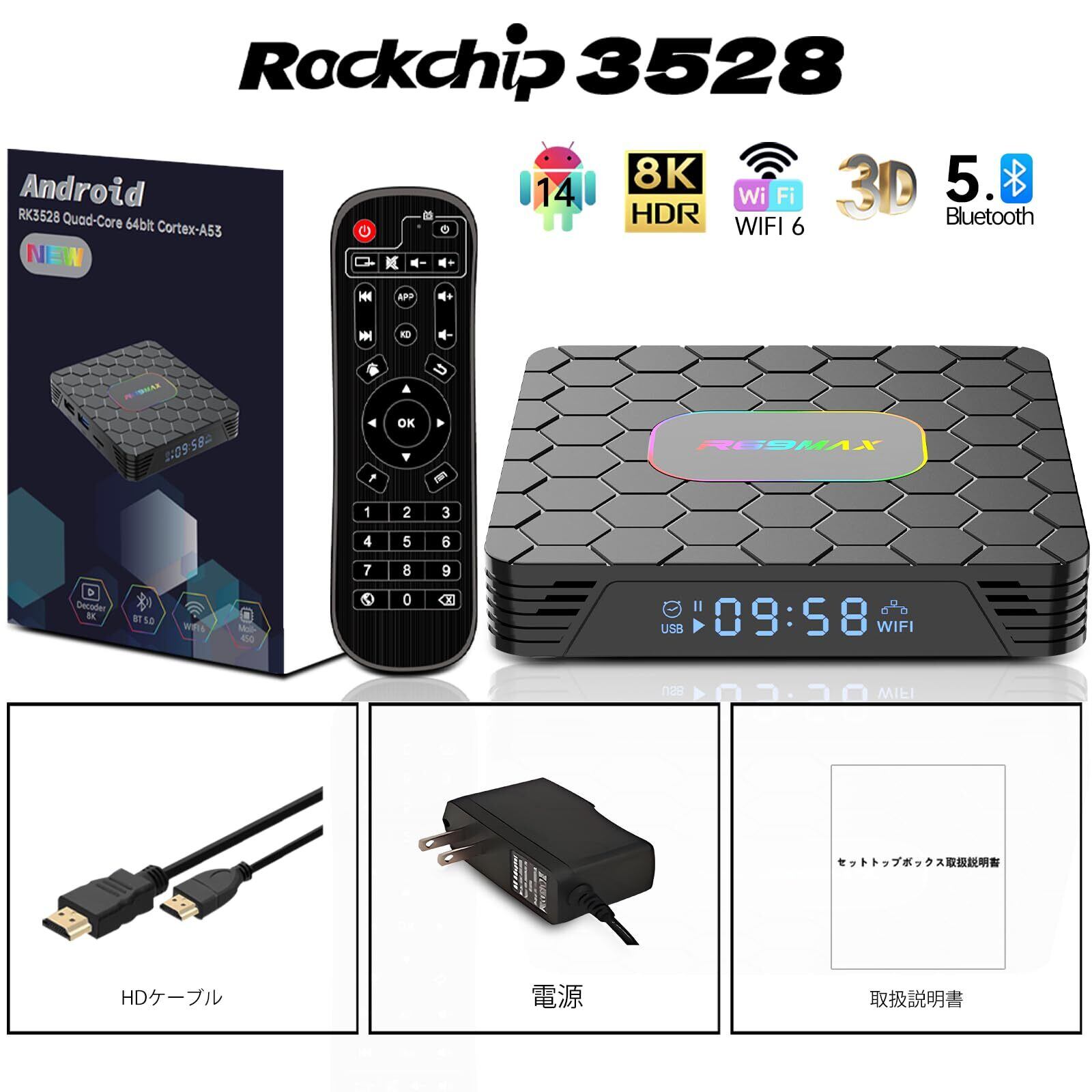 R69MAX Android 14 TVボックス、RK3528クアッドコア、4GB RAM/64GB ROM、WiFi6対応、8Kデコード、HDR10対応、BT5.0、ブラック