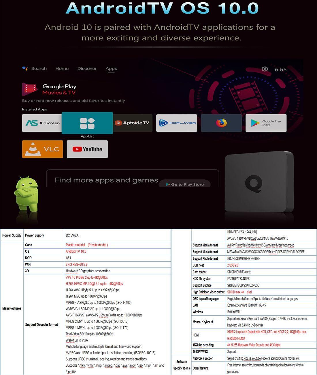 高速Wi-fiネットワークアプリケーションをサポートし、2.4GHZワイヤレスマウス、キーボード、エアーリモコンをサポートします。 オペレーティングシステムはAndroid TV 10.0。OSD言語は日本語/英語/フランス語/日本語およびその他の多言語をサポートします。