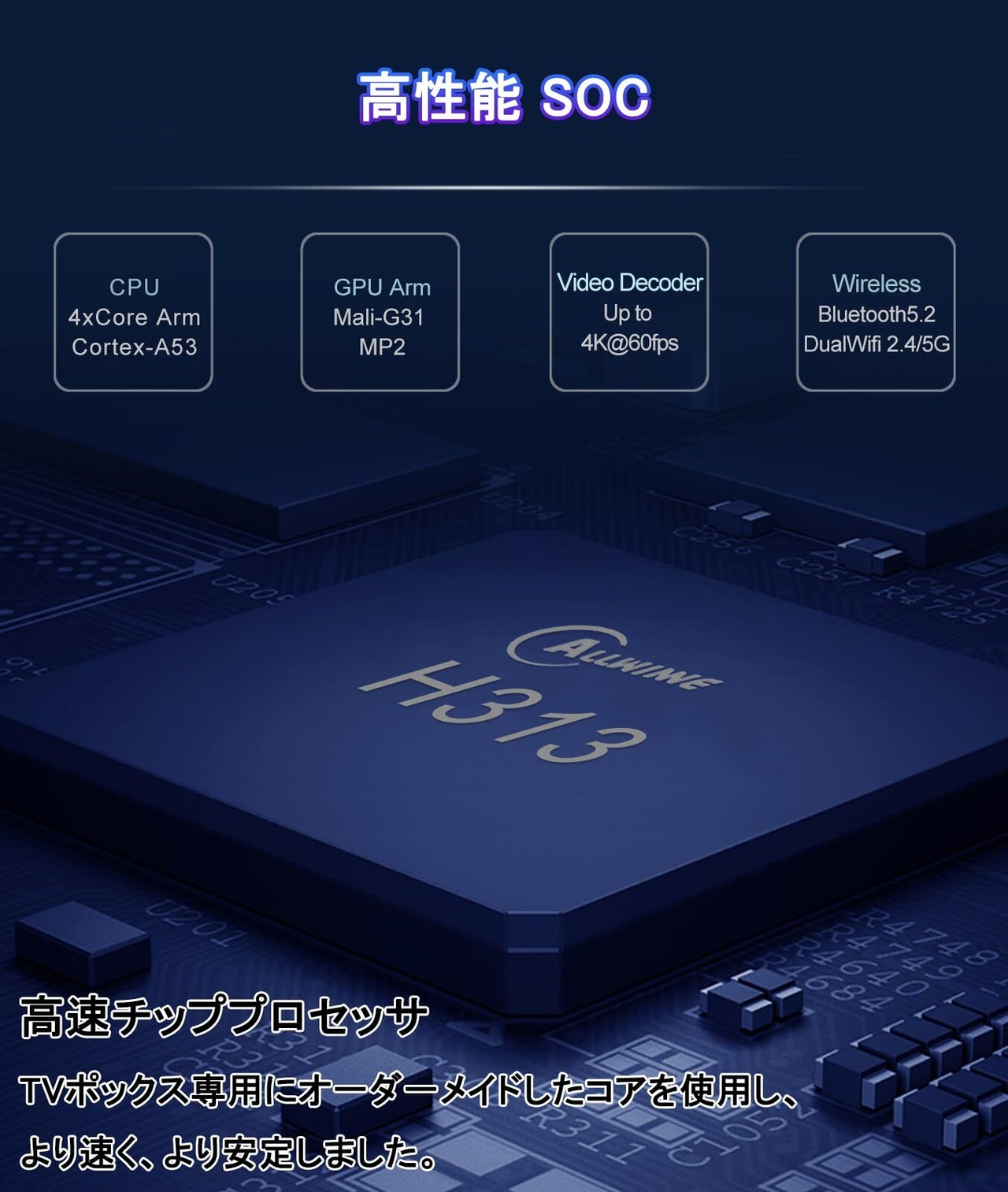 システム構成 CPU H313 クアッドコア Cortex-A53 周波数: 1.5G。 ソフトウェア仕様 ネットワーク機能 Skypeチャット、Picasa、Youtube、Flicker、Facebook、オンラインムービーなど 製品サイズ 92*92*17MM、色黒、カードリーダー SD/SDHC/MMC カード。 セット内容: セットトップボックス + 電源 + HDMI ケーブル + リモコン + マニュアル