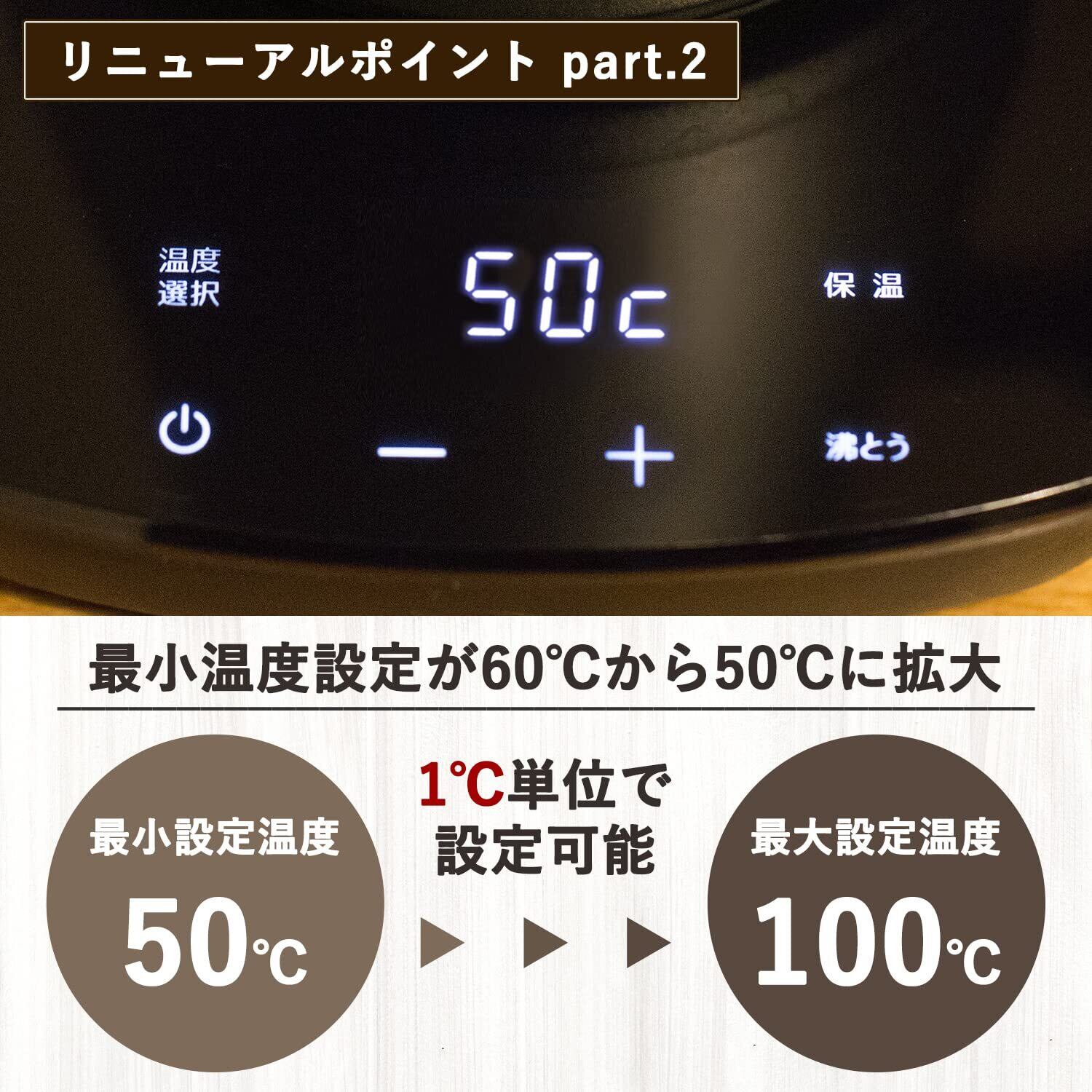 【温度調節】50~100℃の間で1℃単位で温度設定が出来るので、飲み物に合わせた最適温度でお湯を沸かせ、より美味しい飲み物が楽しめます。また、あらかじめ7種類の温度(50/60/70/80/85/90/95℃)もプリセットされております。