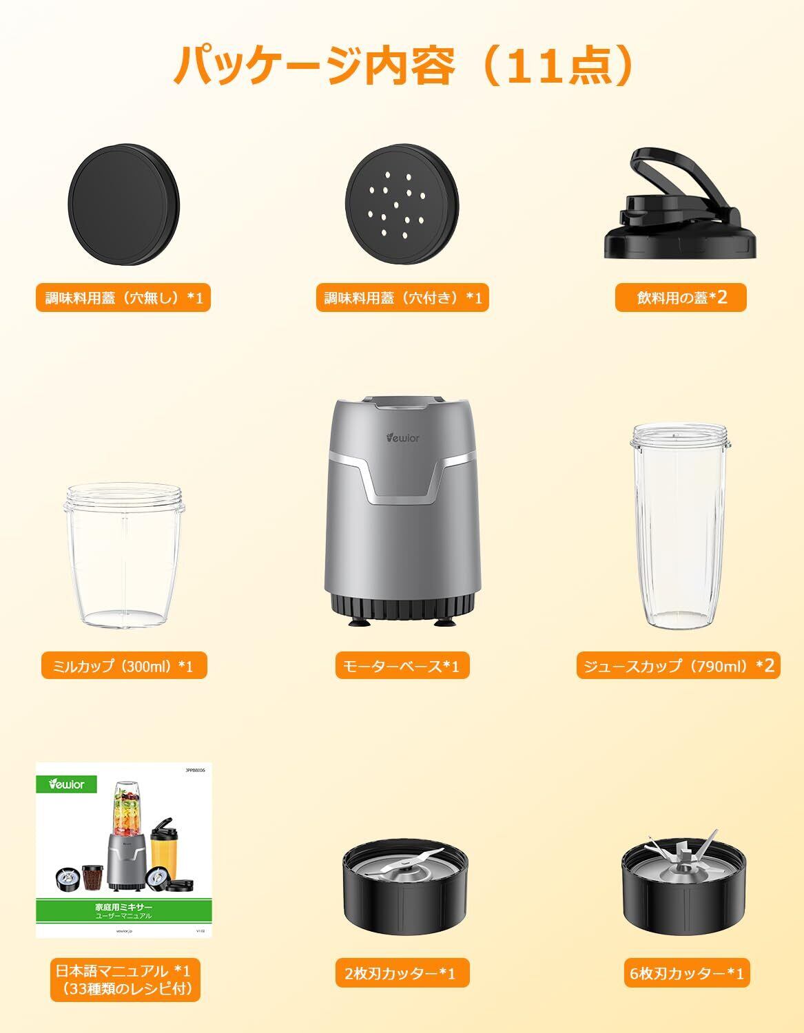 【11点セット&品質】パッケージ内容:モーターベース*1、790mLのジュースカップ*2、300mLのミルカップ*1、飲み口付き蓋*2、穴付き蓋*1、6枚刃カッター*1、、S字型ブレード*1、調味料用蓋(穴無し)*1、調味料用蓋(穴付き)*1と日本語マニュアル、合わせて11点のセット付きます。キッチン/アウトドア/旅行/出張/ジム/オフィス様々な場所で楽に使えます。友達や家族へのプレゼント、誕生日、クリスマスギフトなどに最適です。ご購入日より24ヶ月のサポーターを提供します。期間内、万が一製品に品質問題がある場合、ご遠慮なくにご連絡いただきますようお願い申し上げます。連絡ステップ:[アカウントサービス]-[注文履歴]-[出品者に連絡する]の方でご連絡ください。