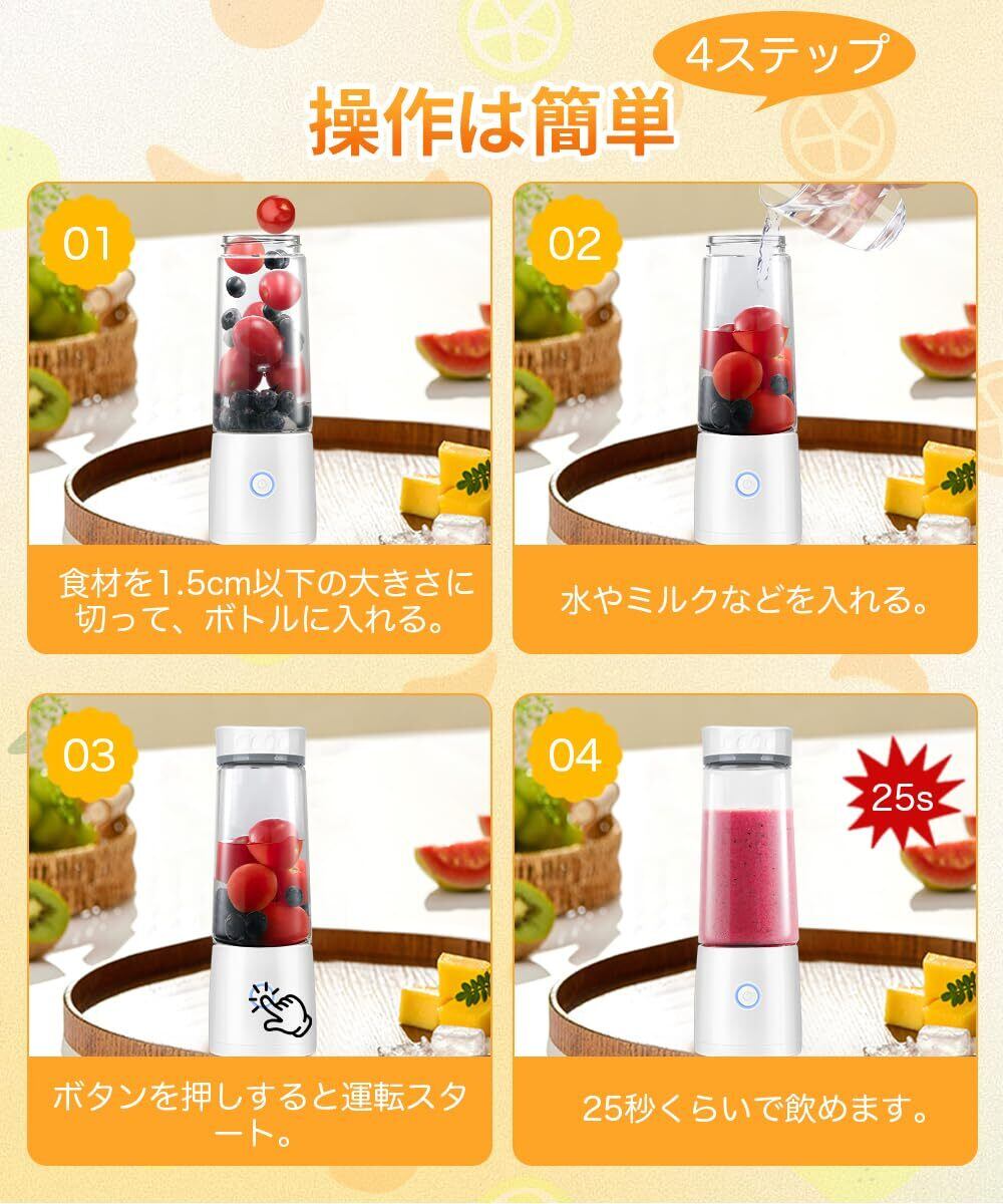 【ご注意事項・品質】①ご使用前にジューサーを2~3時間充電してください。②食材を小さく切って(1.5*1.5cm)、適量の水や牛乳を加えて起動してください。③食感をよくするために、搾汁中に手で軽くジューサーを振ることができます。の製品は1年間品質期間が付いてるので、もし使用中に何かの問題がありましたなら、是非お気軽にお問い合わせください。