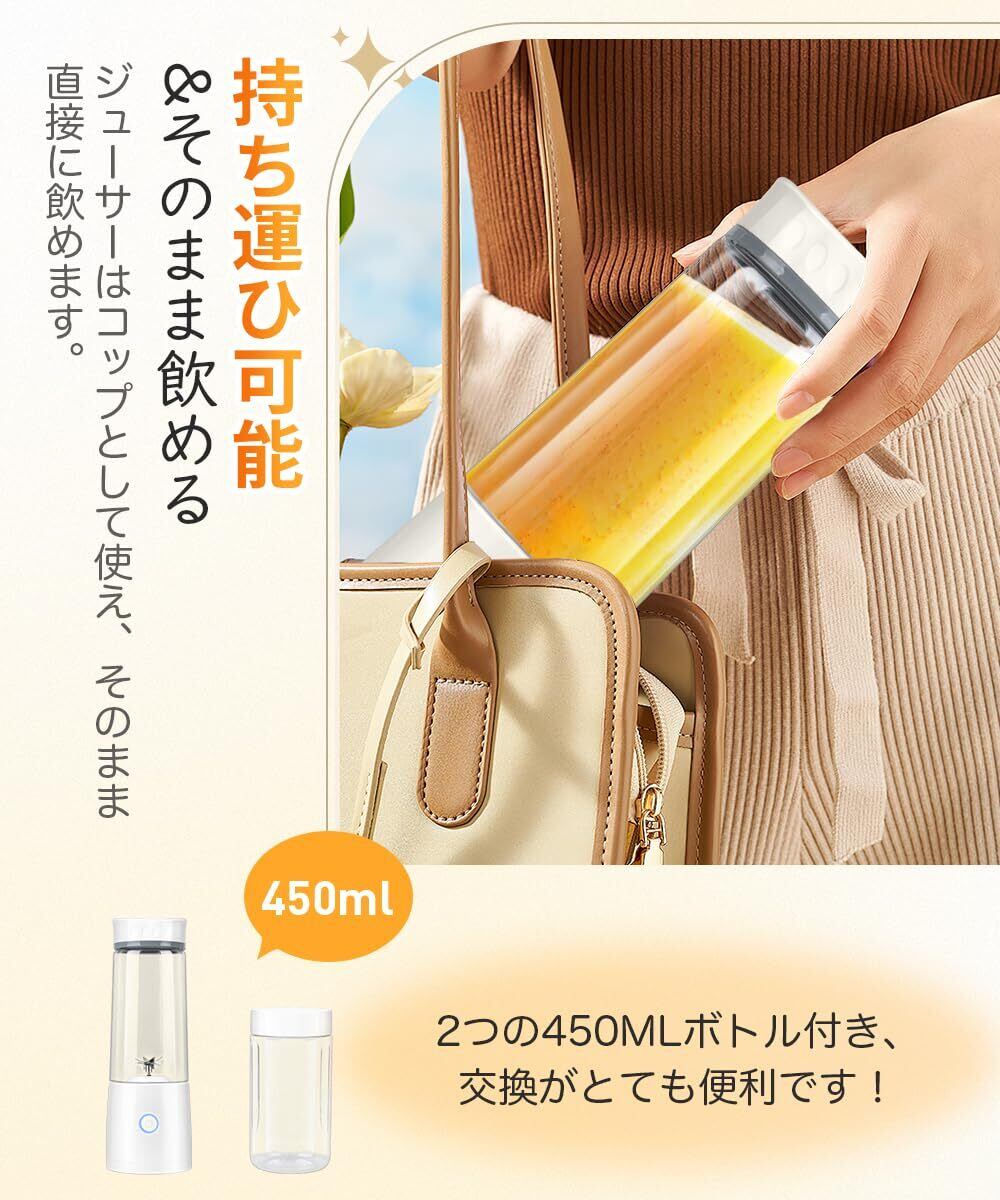 ジューサー ミキサー 小型 一台多役 果物 野菜 氷 ジュース スムージー 離乳食用 栄養補充 氷も砕ける 2つ450MLボトル 22000高速回転 USB充電式 お手入れ簡単 一人用 ミニ 持ち運びやすい 学校 旅行 出張 オフィス アウトドア 日本語取扱説明書付き