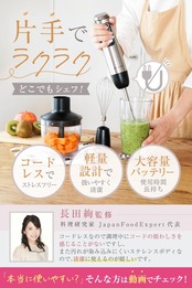 【片手でラクラク、どこでもシェフ!】お料理好きの全ての方に向けて企画しました。「どこでも気軽に、そして簡単清潔に使えるものを」というコンセプトのもと、コードレスでも十分なパワーと何度も使える大容量バッテリーを搭載した商品を開発。特に離乳食や介護食などを作る機会の多い女性の方でも片手で楽に使えるものに軽量化も実現しました。キッチンスペースにスタイリッシュさと清潔感を表現できるよう、粒子結晶が細かいため汚れが染み込みにくく、臭いも付きづらいステレンスボディを採用しました。