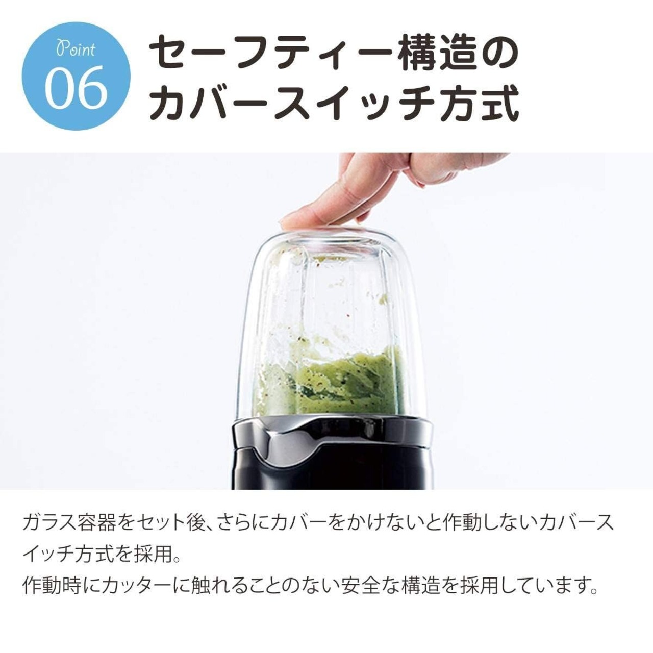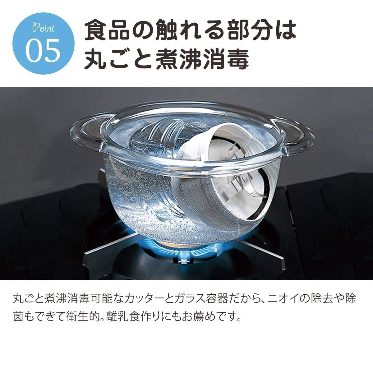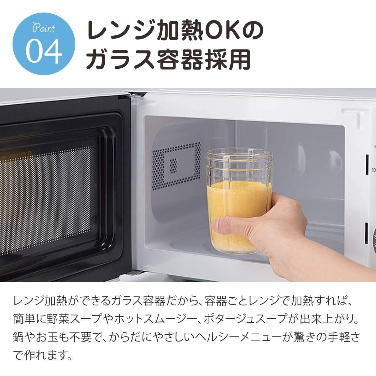 レンジ加熱OKのガラス容器採用:容器はレンジ加熱OKですので、粉砕後のジュース状の野菜をポタージュスープにもできます。食品の触れる部分は丸ごと煮沸消毒:食品が触れる容器とカッターは丸ごと煮沸消毒できるので、衛生的に使えます。