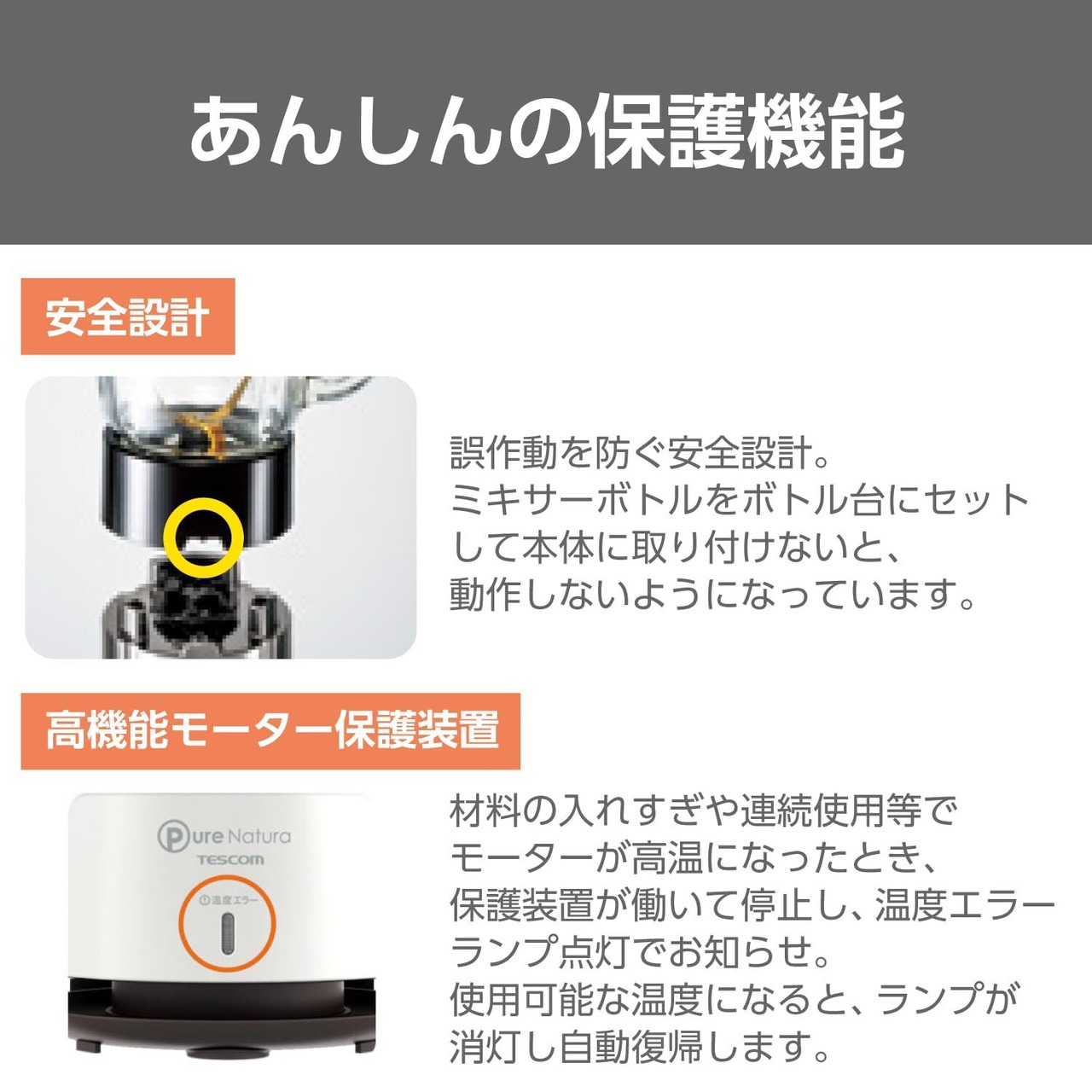 材料の入れすぎや連続使用等でモーターが高温になったとき、保護装置が働いて停止し、温度エラーランプ点灯でお知らせ。 使用可能な温度になると、ランプが消灯し自動復帰します。
