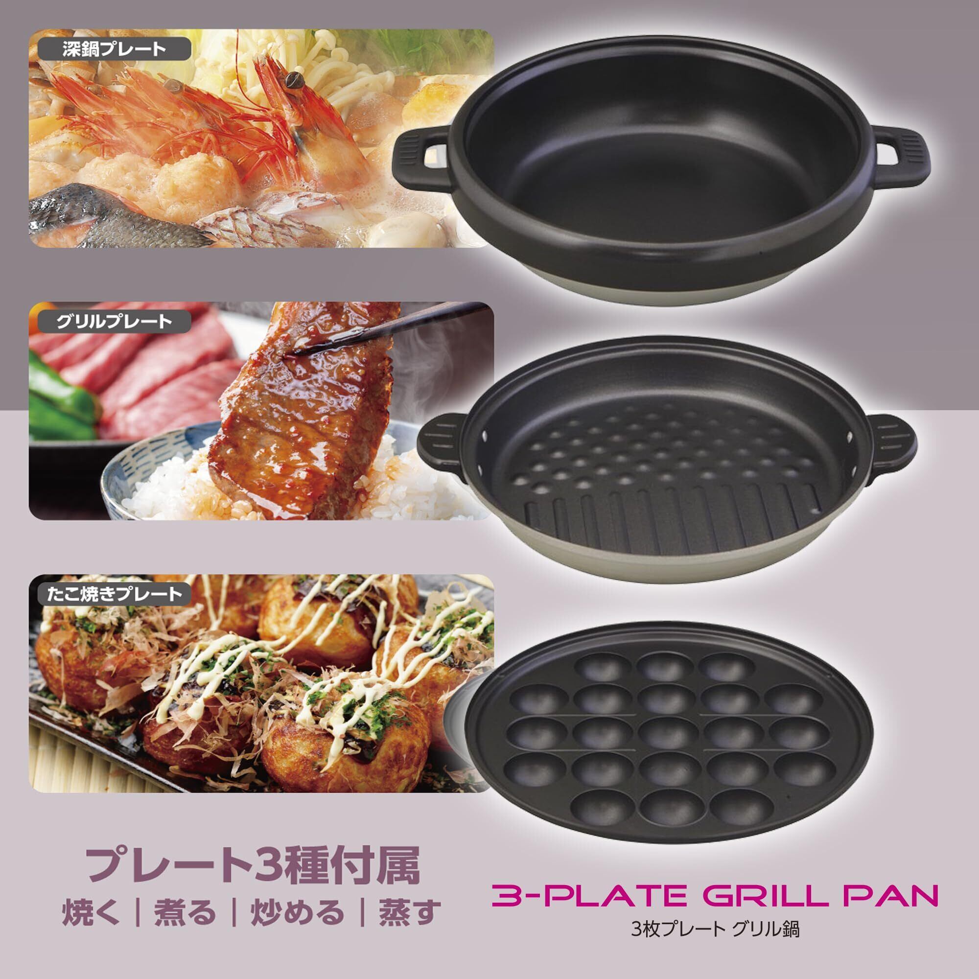 東京Deco グリルなべ ホットプレート 脱着式 3枚プレート 深型 深さ7.5cm ガラス蓋 1300W 3~4人用 [深なべ・グリル・たこ焼 プレート3枚付き][3~4人用 3枚プレート] グリル鍋 電気鍋 2人用 一人用 電気 4人用 グリル プレート 蓋付き パン 魚 キッチン ホットプレート 大型 鍋 焼肉 一人暮らし 二人暮らし フッ素加工コーティング 電気鍋 グリルなべ d000
