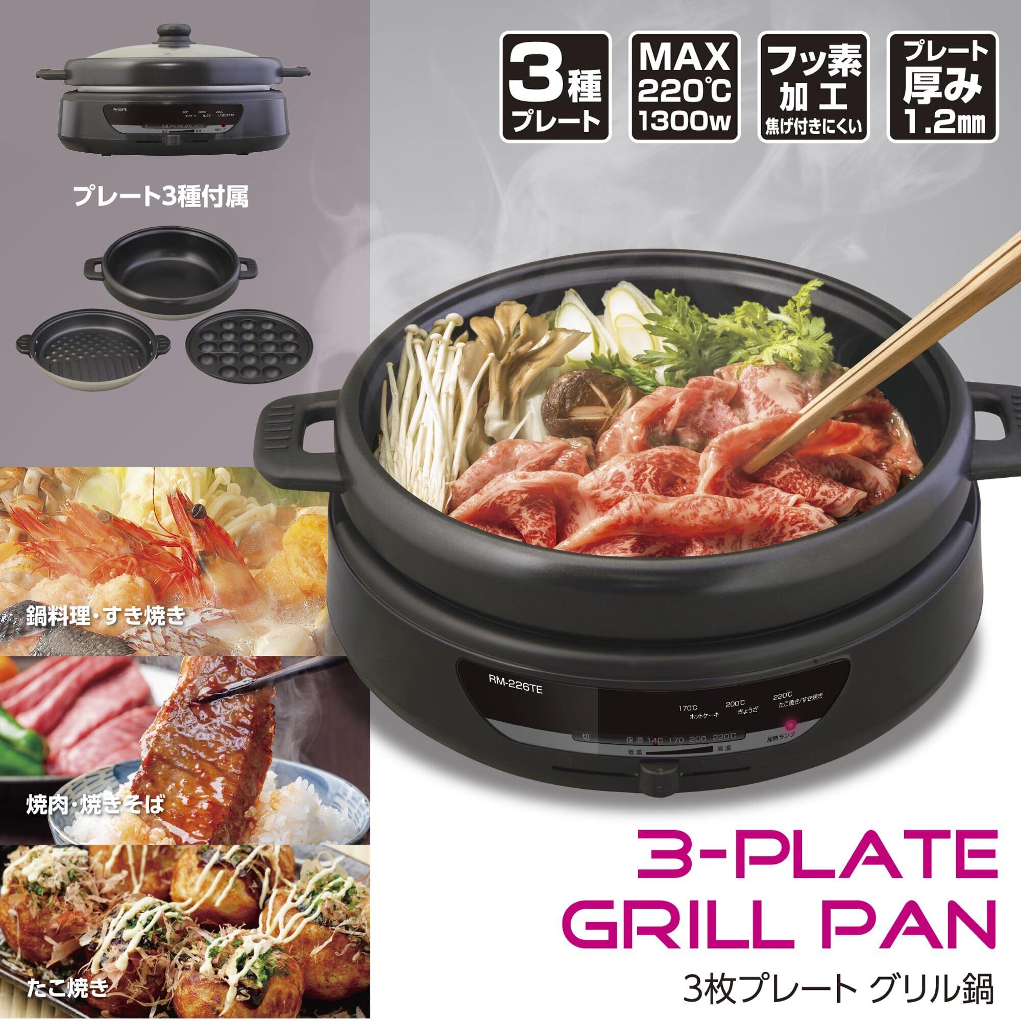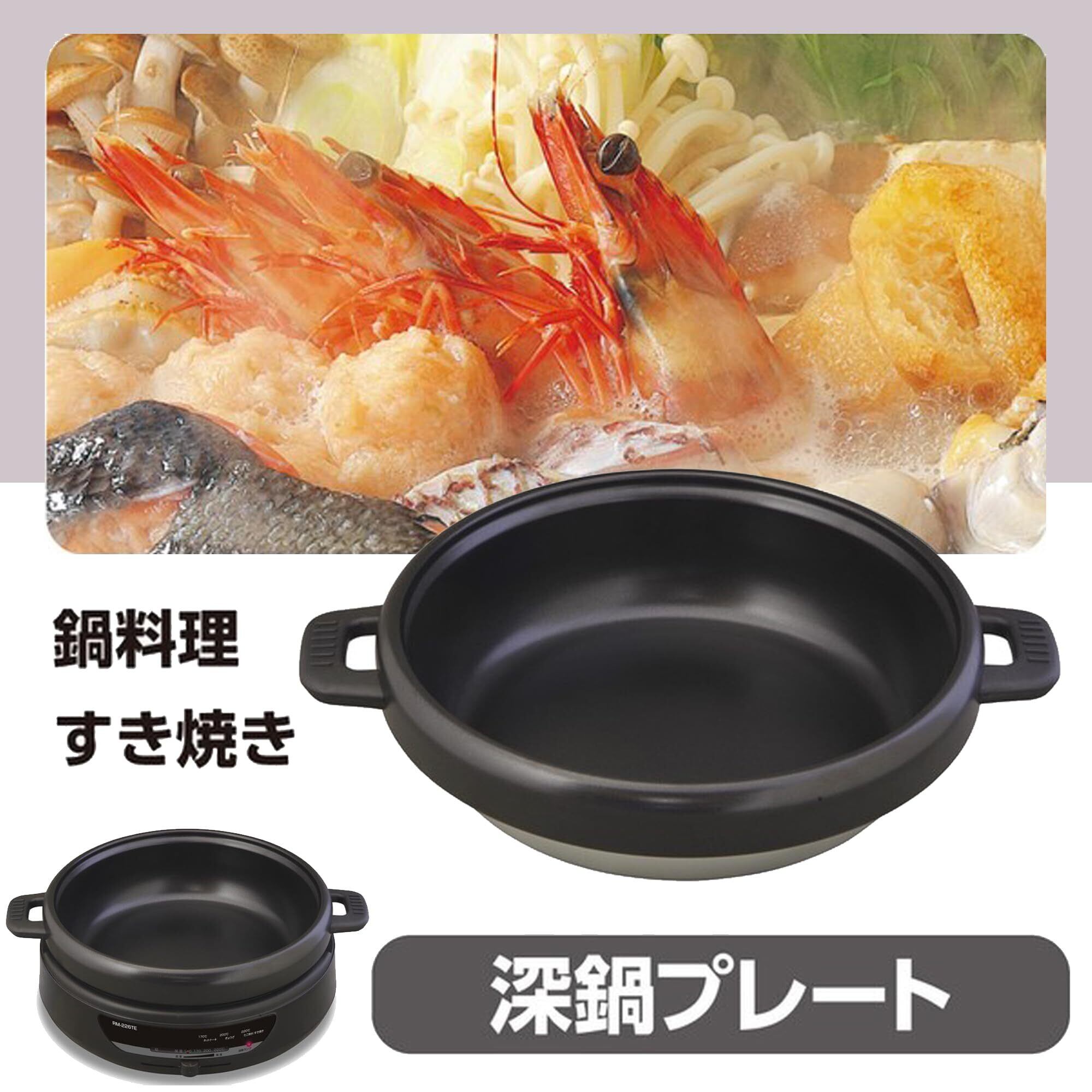 [機能] 着脱式深鍋プレート(グリルプレート・深鍋プレート・たこ焼プレート) / 最大220度の強力加 / ハイパワー1300W /フッ素加工コーティング