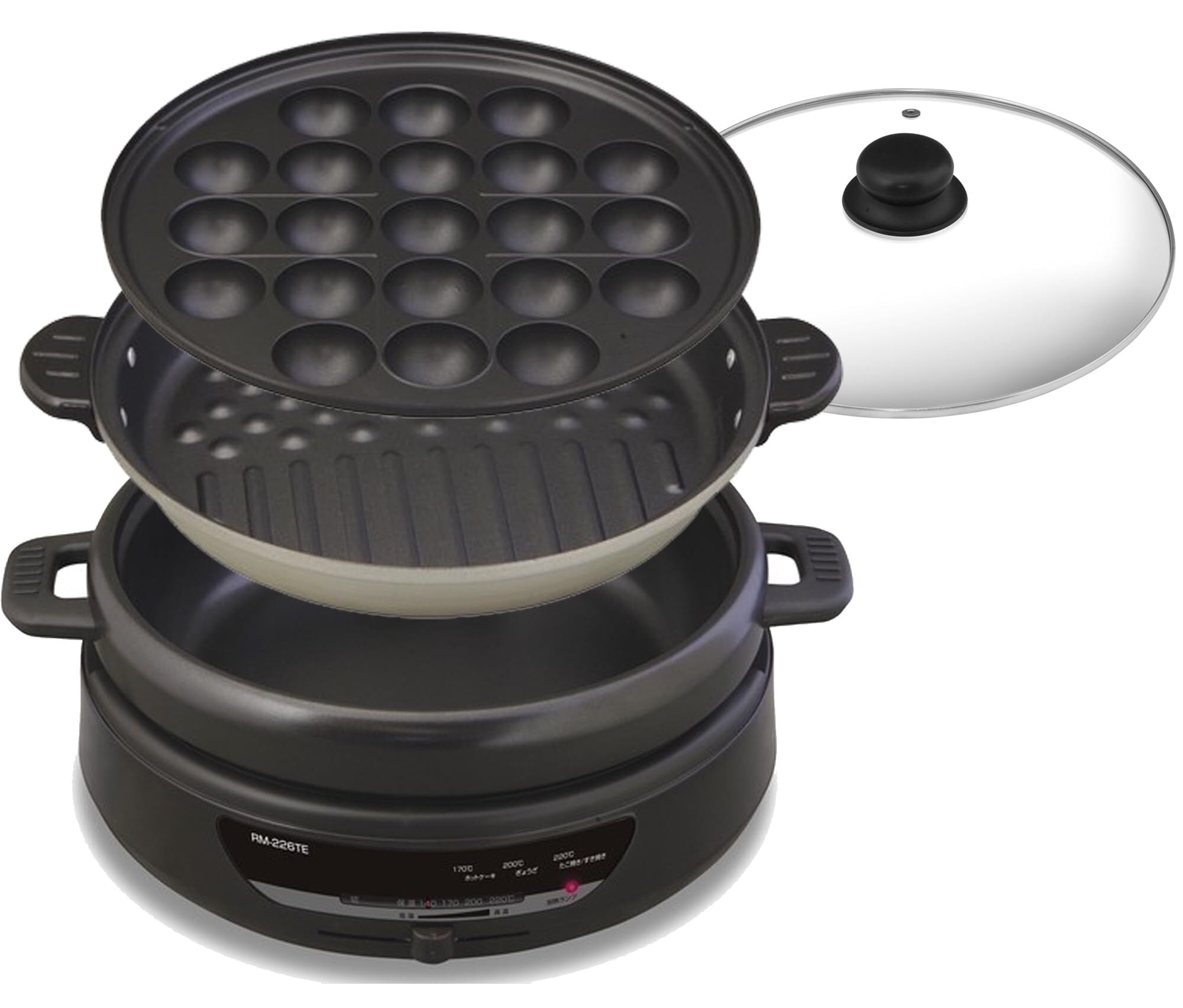 [内寸] 深鍋:直径27cm・深さ7.5cm / グリル鍋:直径27cm・深さ4cm / たこ焼き:穴21個