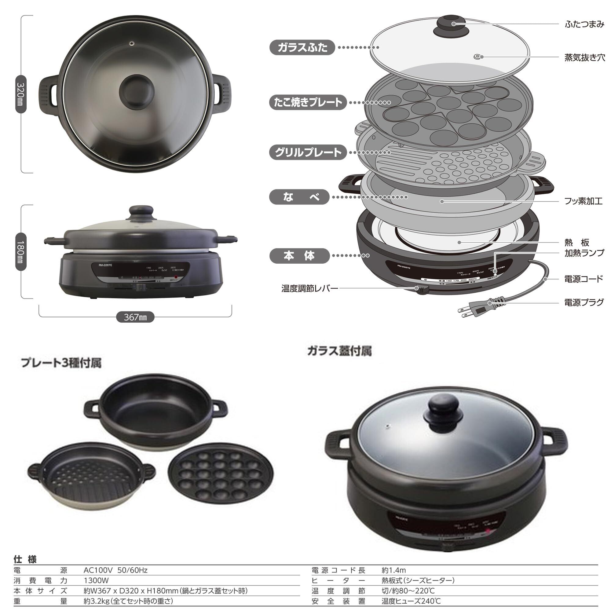 [電源] AC100V 50/60Hz / [消費電力] 1300W / [温度調整] 切・約80℃~約220℃