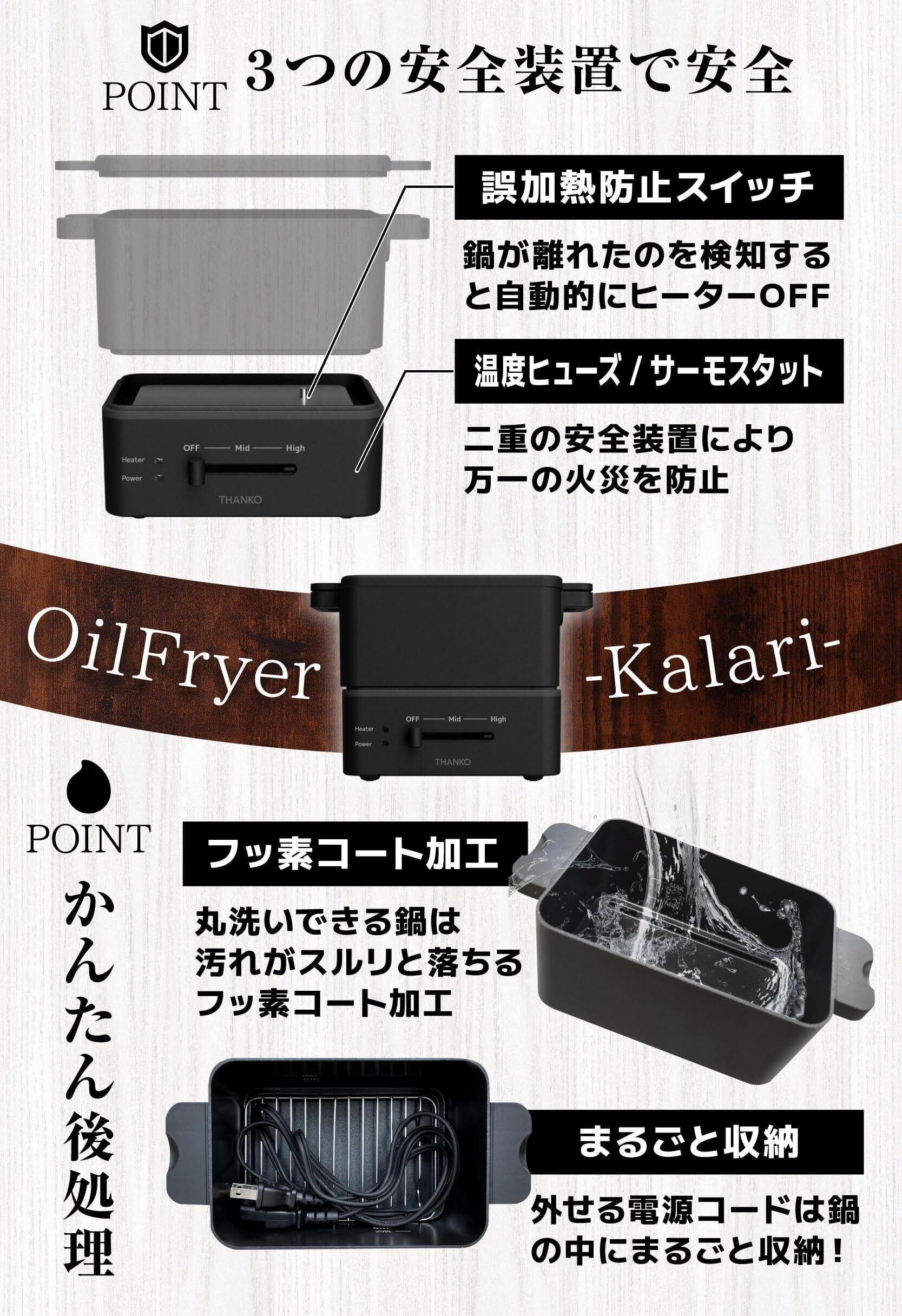 【数量限定】卓上電気フライヤー 蓋/油受け付き 丸洗い可能 300ml 一人分 THANKO おひとりさま用フライヤー「カラリ」SGLFRYSBK