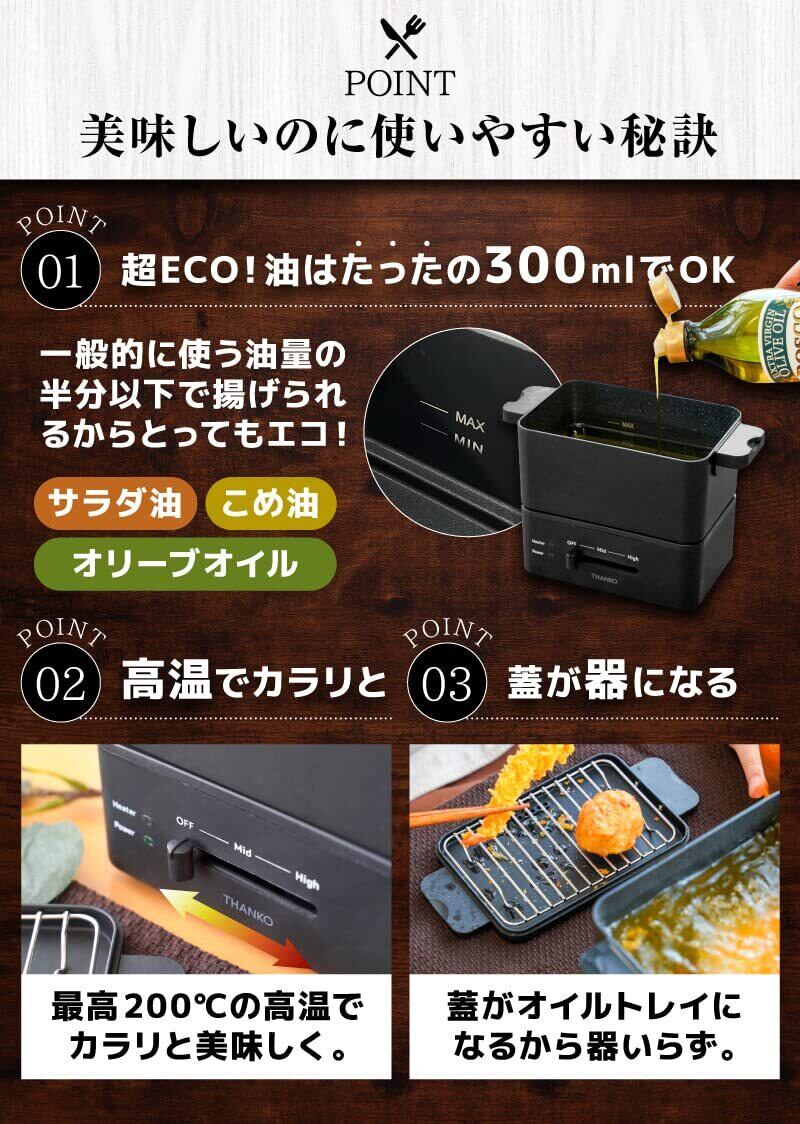 ■【安心の使い勝手!】電源オフのタimer機能を搭載しているため、忙しい時でも安心して利用できます。また、必要な分だけ揚げることができ、余分な油の使用も抑えられます。新しい料理の幅を広げ、毎日の食卓を楽しく彩る助けになるでしょう。