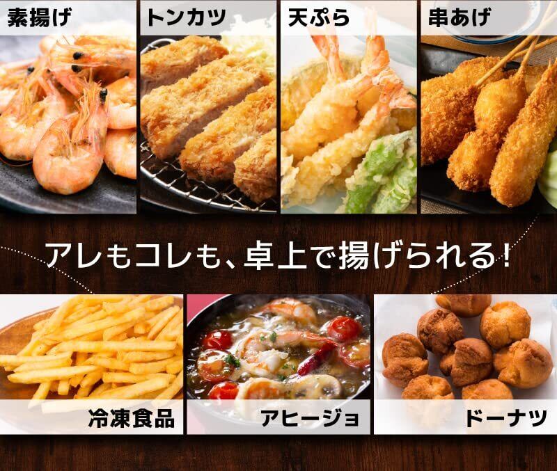 ■【温度調節機能で理想の揚げ加減に!】温度調整ができるので、食材に合わせた最適な揚げ加減で料理が楽しめます。アツアツのから揚げやサクサクのフライドポテトなど、あなた好みの揚げ物が実現します。これ一台で、様々なメニューを素早く用意できるのが嬉しいポイントです。