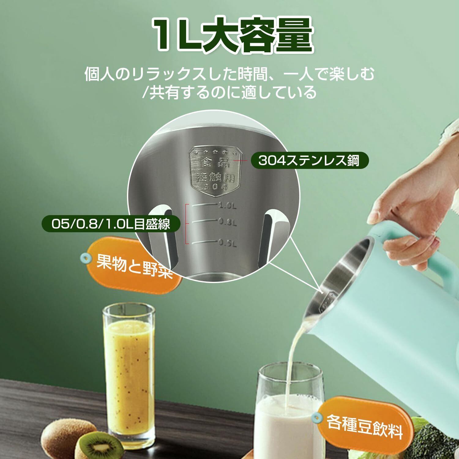 栄養補充:出来立ての豆乳で良質なタンパク質と食物繊維を摂取でき、新鮮な大豆や野菜など具材に熱を加えて攪拌まで全自動で調理できます。容量は1000mlで一度に軽めの1~4人分は作れます