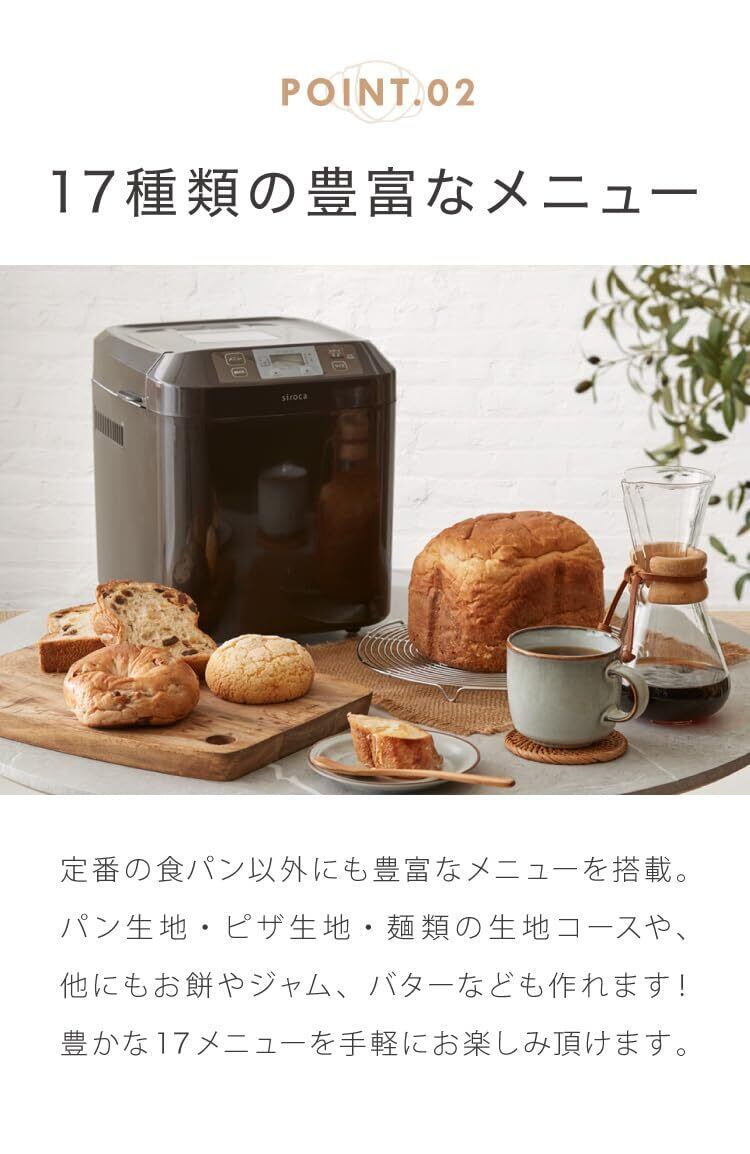 ■【家庭で手軽に本格的なパン作り!】sirocaのホームベーカリーは、1斤から2斤のサイズに対応した便利なアイテムです。選べる17種類のメニューを搭載し、あらゆる好みに応じたパンを簡単に作ることができます。これ一本で、焼きたての美味しいパン作りを楽しめます!