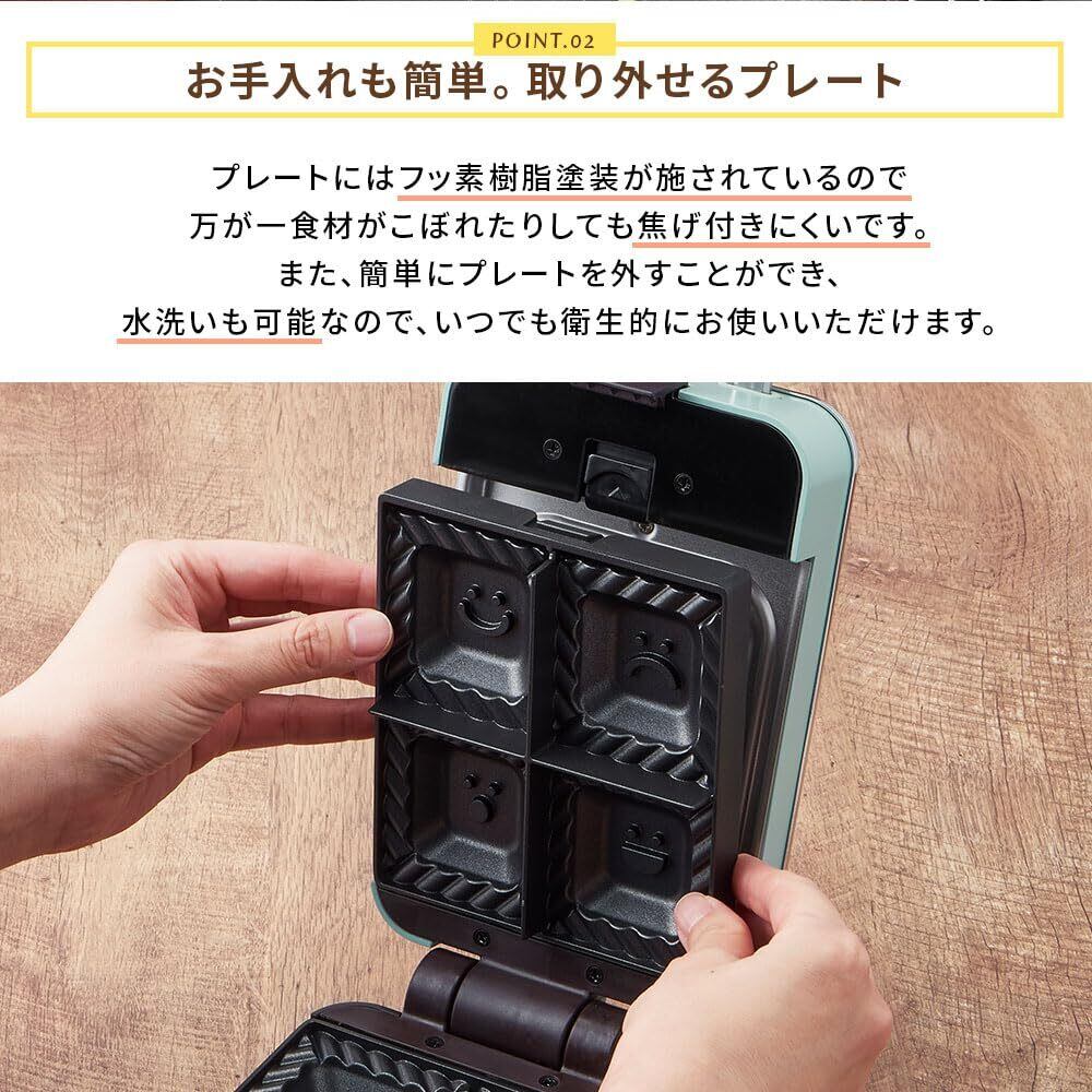 史上初!? 約5×5cmサイズのホットサンドが1度に4つできるホットサンドメーカー! 食パンを1/4サイズにカットしたミニミニサイズのホットサンドは おやつやお弁当にもぴったり!スナック感覚で楽しめます プレート交換式で、食パン1枚そのままのサイズのホットサンドもできます! 別売のハーフプレートに交換すれば、ハーフホットサンドもつくれます。
