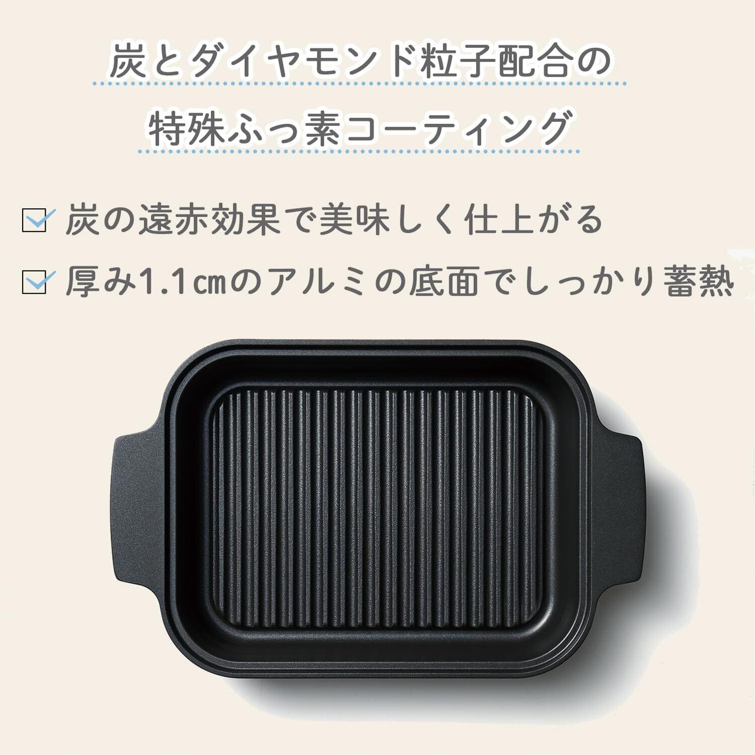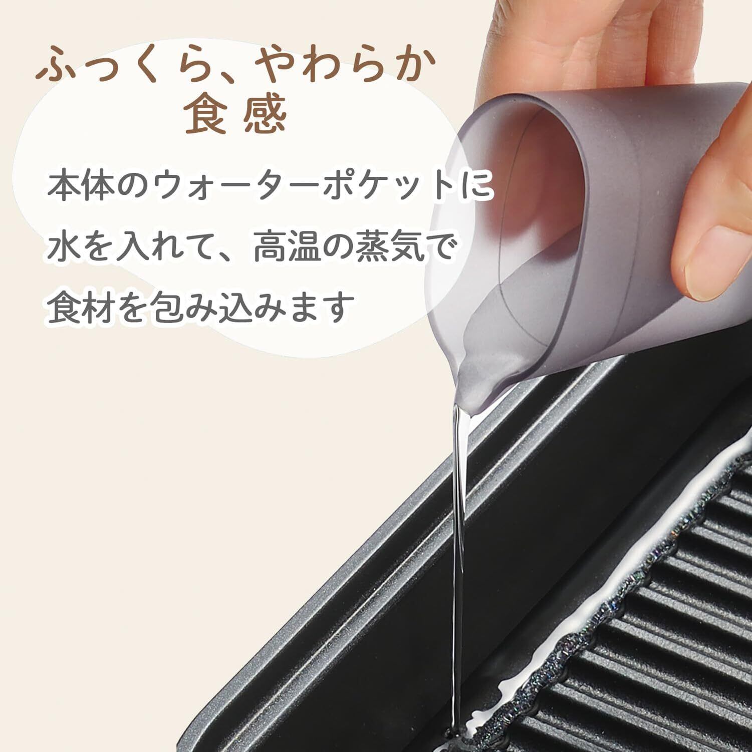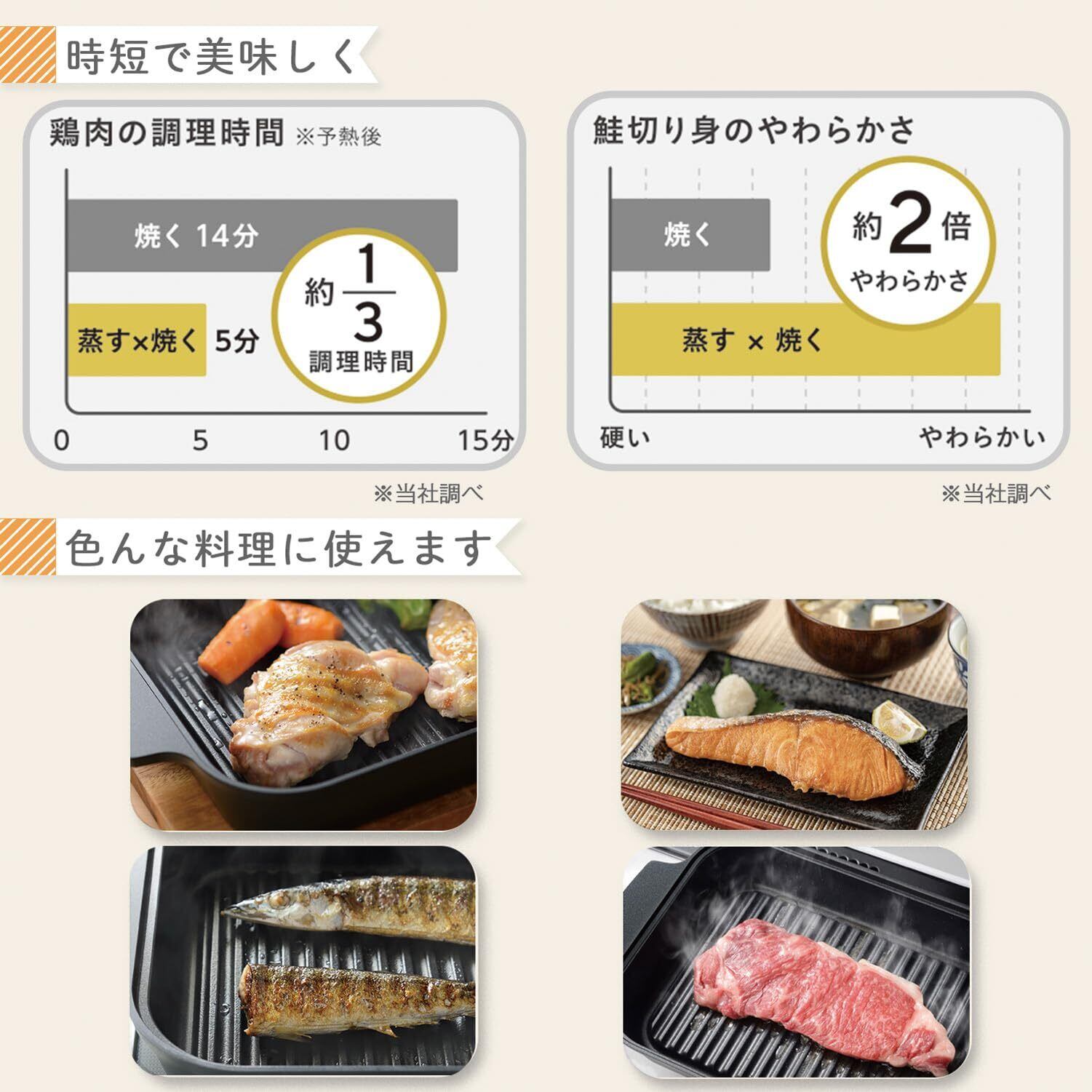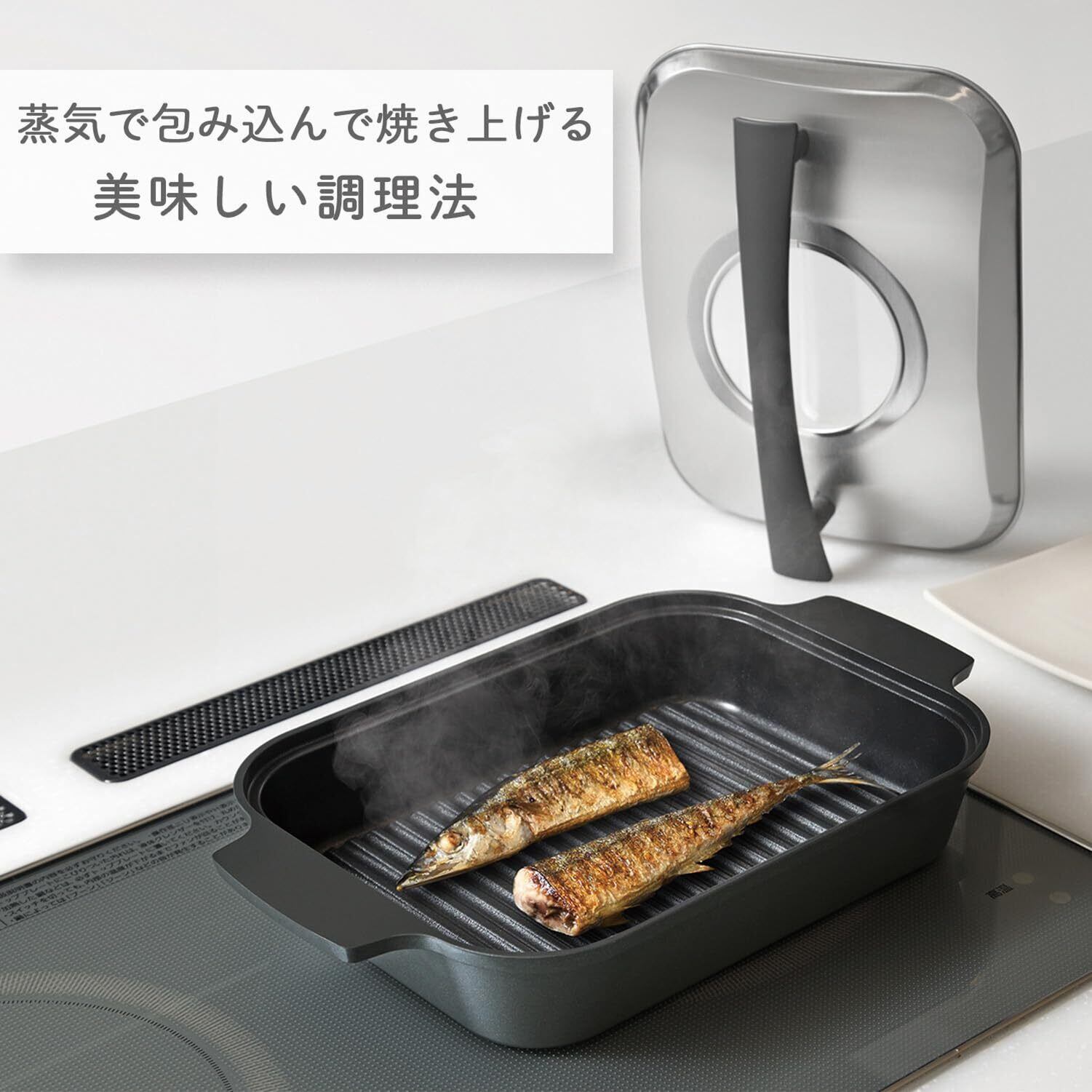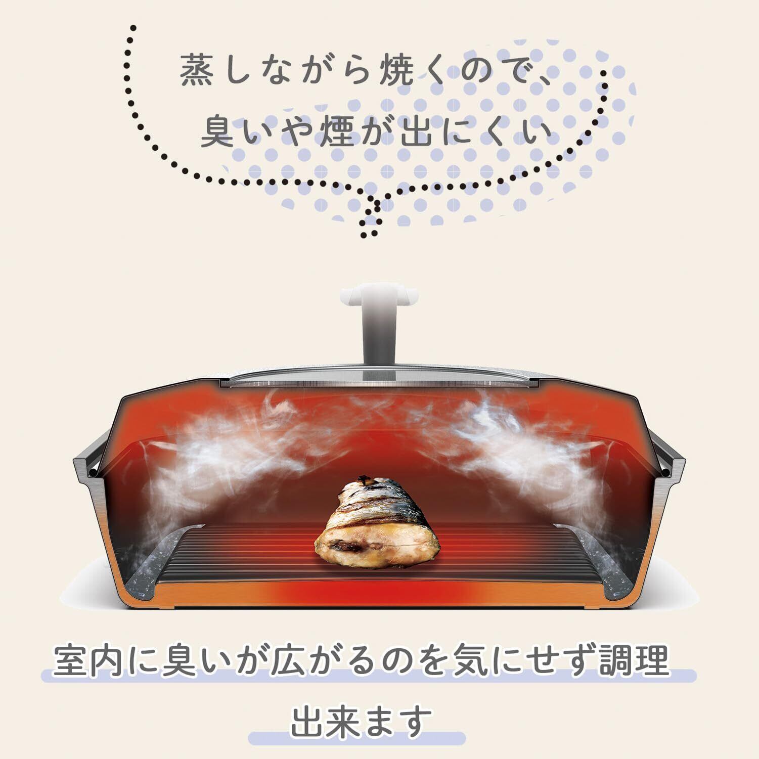 ●蒸して焼ける魚焼き、お肉もヘルシーに焼き上げる。●「蒸す×焼く」でヘルシーに時短で焼き上げる魚焼きロースター。●本体のウォーターポケットに水を入れて、高温の蒸気で食材を包み込み、ふっくらとやわらかい食感に仕上がります。●魚だけでなく、お肉、野菜、お餅などさまざまな食材を調理できます。●IH200V・100V、ガスなど様々な熱源で使用できます。●蓋は左右どちらでも立てて置けるので調理スペースを有効に使えます。●焦げや傷がつきにくくお手入れしやすいフッ素コーティングを施しました。●IHやガスなどの様々な熱源に対応 ※海外製IHクッキングヒーターでは使用できない機種もあります。