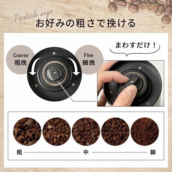 「無段階の粒度設定」粒度設定で、細挽き・中挽き・粗挽きなど無段階の粒度設定(挽き目・ひきめ)ができ、挽いた豆の粗さによって、風味や味わいがガラリと変わります。細かく挽く ⇒ 濃く苦めの味わい、粗く挽く ⇒ 薄く軽めの味わい、お好みに合わせて選ぶことができます。