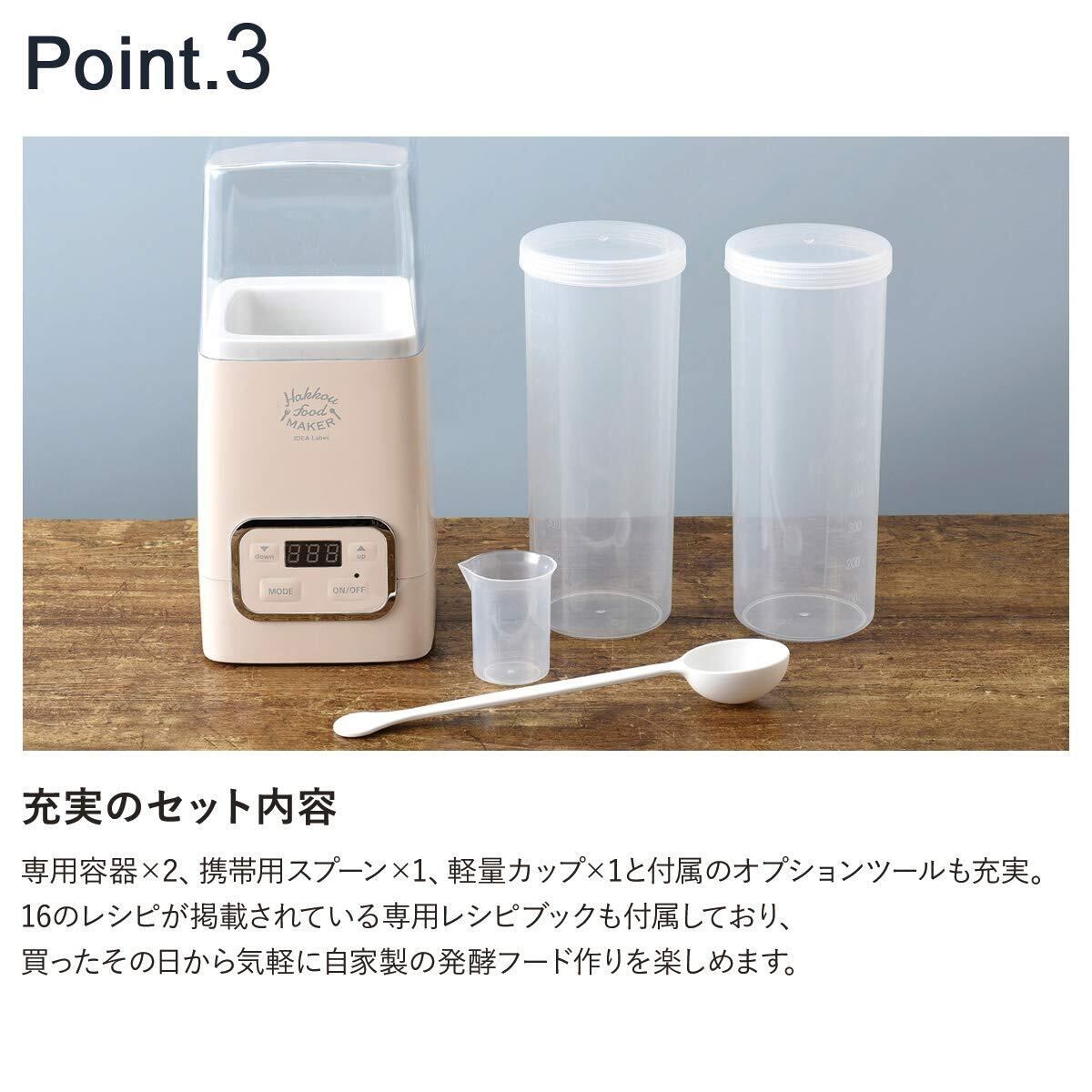 ■牛乳パックもそのまま入るサイズ感 本体には500mℓ~1ℓの牛乳パックがすっぽり入り、別容器に移し替える手間いらず。 牛乳パックごとヨーグルトを作れるので毎日の習慣も無理なく続けられます。 その他、甘酒やチーズ、塩麹などの発酵フードは、付属の専用容器に入れてお手軽に!