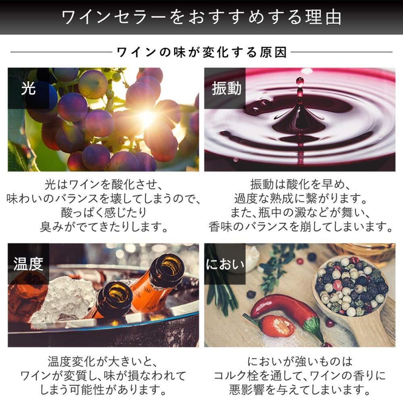 ■【収納と取り出しが簡単!】8本のワインボトルがしっかり収まるコンパクトな設計で、キッチンやダイニングのスペースを有効活用できます。また、庫内のLEDライトがボトルを明るく照らし、選びやすさを提供します。