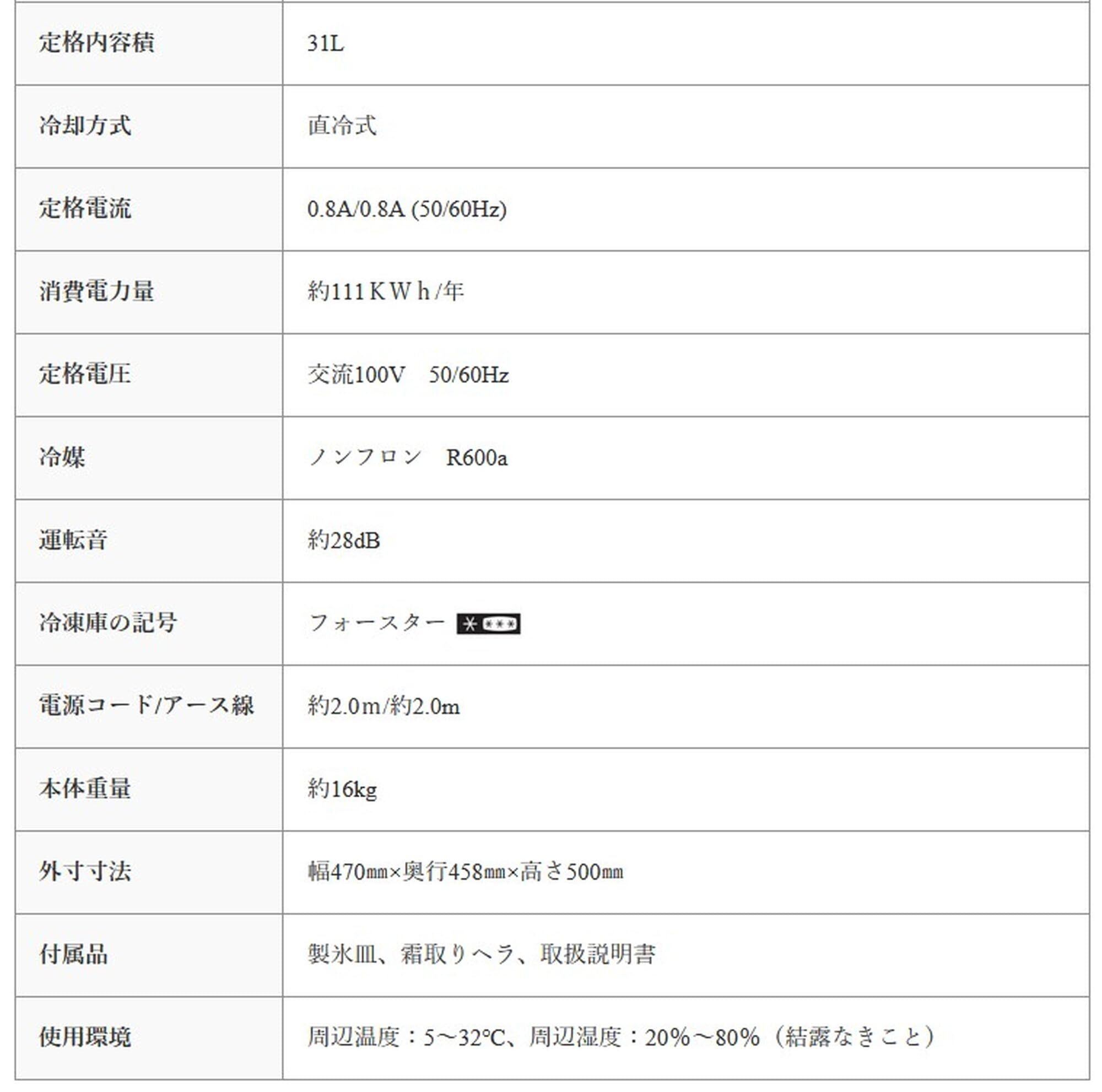 [定格内容積] 約31L / [冷却方式] 直冷式