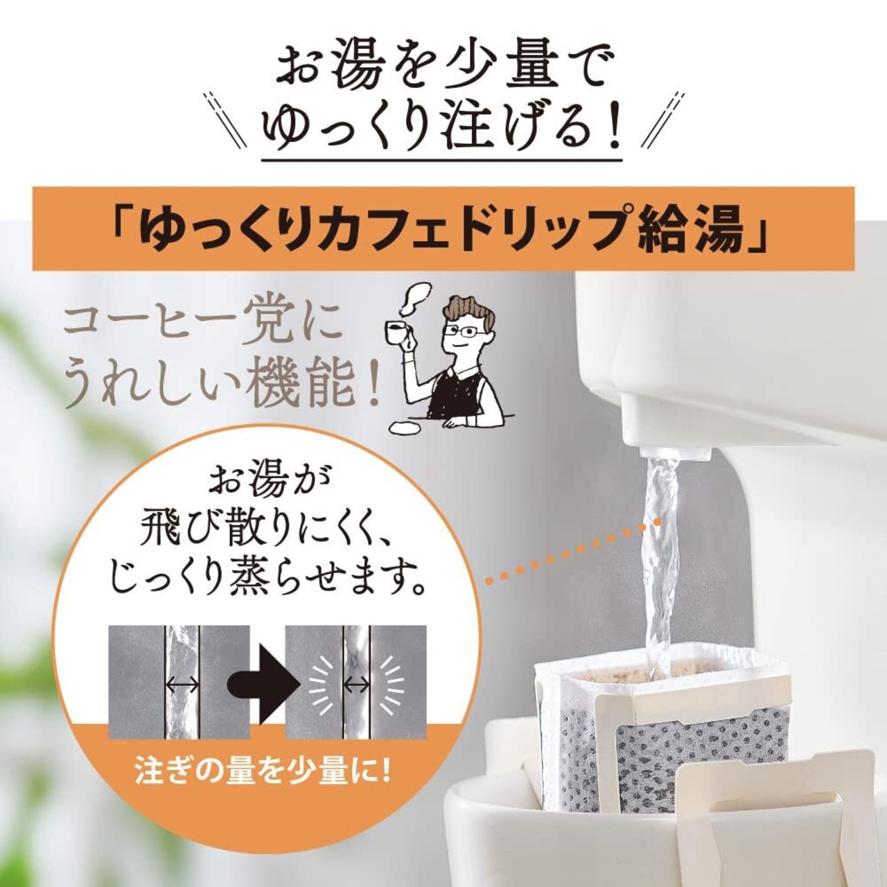 少量をゆっくり注げる「ゆっくりカフェドリップ給湯」