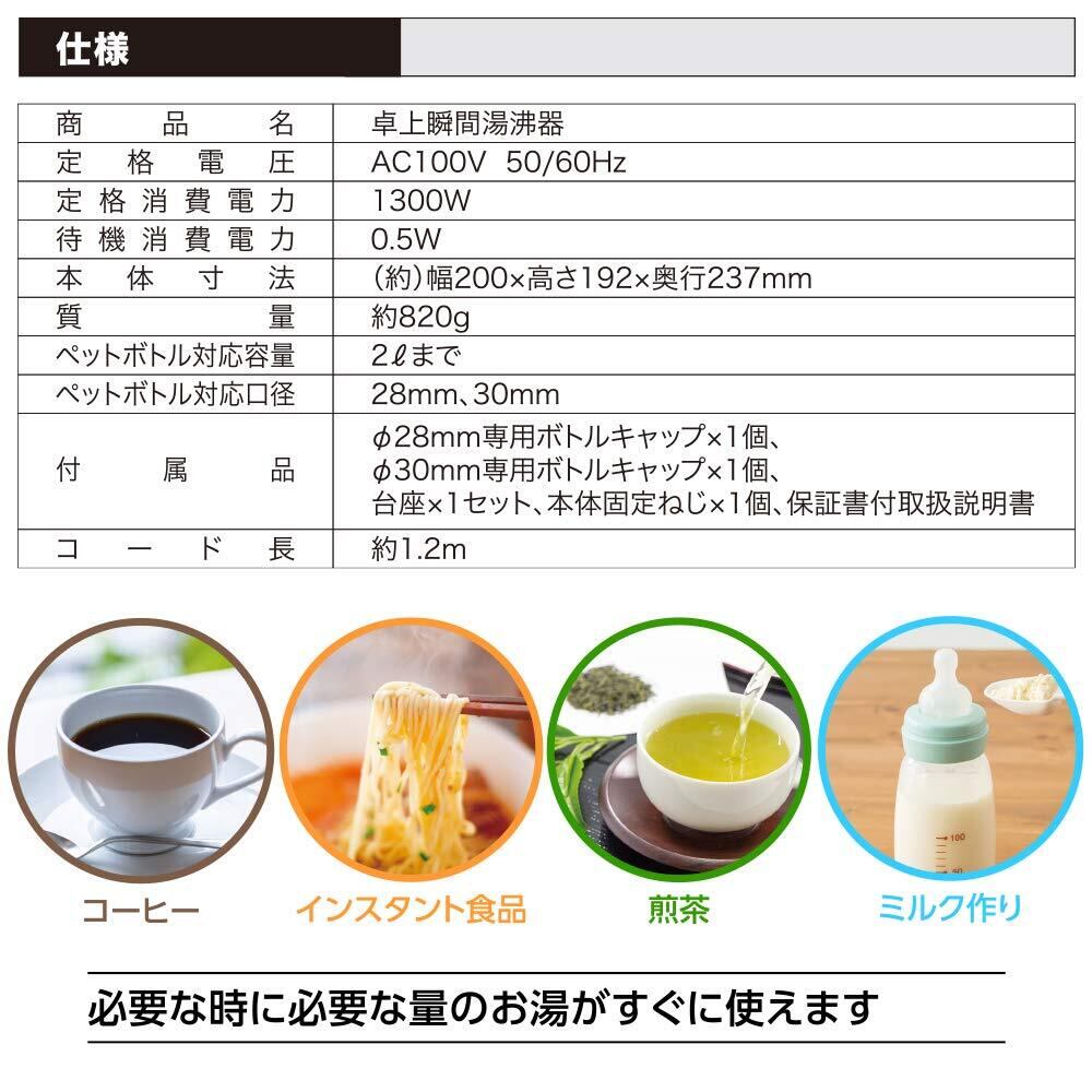 【 仕 様 】■ 定格電圧:AC100V 50/60Hz■ 定格消費電力:1300W■ 待機消費電力:0.5W■ 本体寸法:(約)幅200×高さ192×奥行237mm(台座含む)■ 質量:約820g■ ペットボトル対応容量:2Lまで■ ペットボトル対応口径:28mm、30mm■ 付属品:φ28mm専用ボトルキャップ×1個、φ30mm専用ボトルキャップ×1個、台座×1セット、本体固定ねじ×1個、書付取扱説明書■ コード長:約1.2m