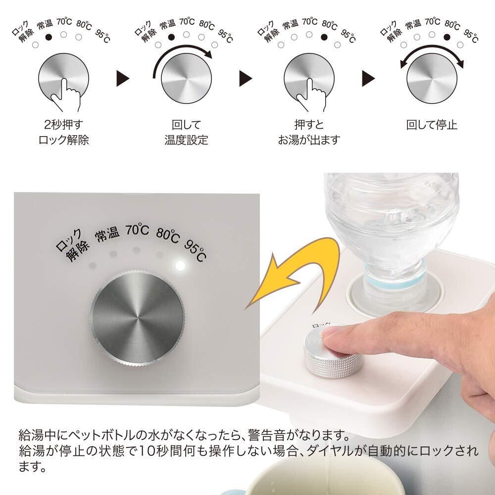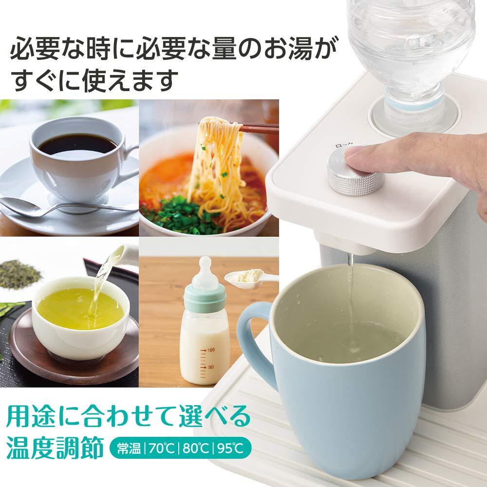 【 特 長 】● 必要な時に必要な量のお湯がすぐに使えます● 用途に合わせて、温度を常温/70℃/80℃/95℃に調節できます ※温度は給湯口通過時の温度です。● 2Lペットボトル対応● 空炊き防止機能付● 安全ロック機能付