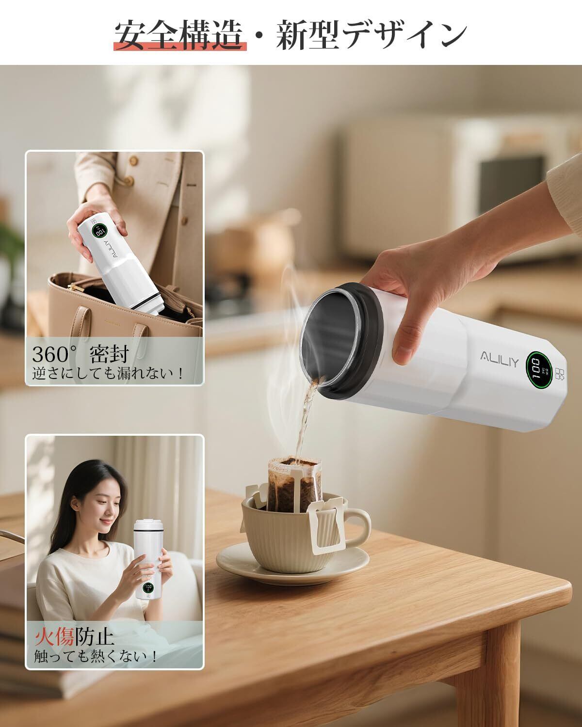 【3.0時代へ進化!小型電気ケトルで自由な水生活を】個人向け・専用のALILIY ポータブル電気ケトル。日常生活に適切な水分補給は体の調子を整え、集中力を高め、健康的な生活を支えてくれます。1.0時代の家庭用電気ケトルは自宅のみで使用、持ち運びに不便。また2.0時代のワンタッチ式小型ケトルは小型で便利ですが、水を100℃だけ沸騰させて、温度調節ができません。今度3.0時代スマート携帯電気ケトルは利用し、個人向けの水生活を楽しもう!