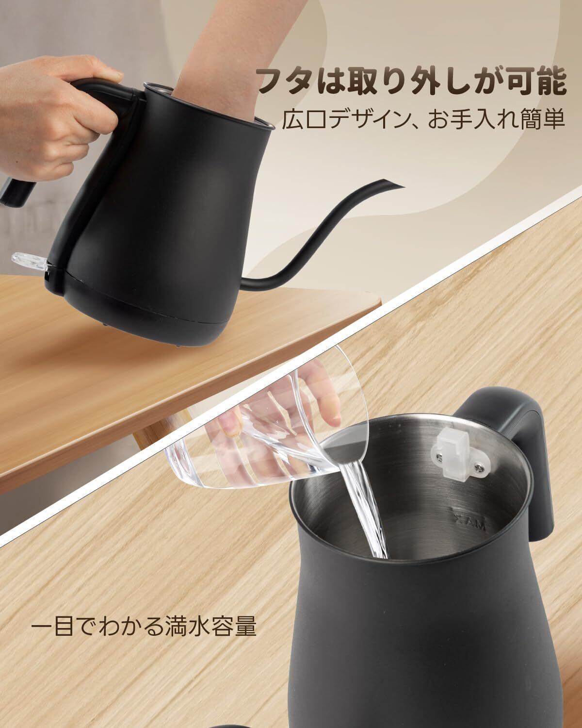 【限定セール】【mochizukistore】 電気ケトル コーヒー ドリップケトル 0.8L 1000W 電気ケトル ワンタッチ スリムノズル おしゃれ 空だき防止 湯沸かし ケトル 湯沸かしポット コーヒー 紅茶 お茶 新年 プレゼント用 キッチン 黒 ブラック