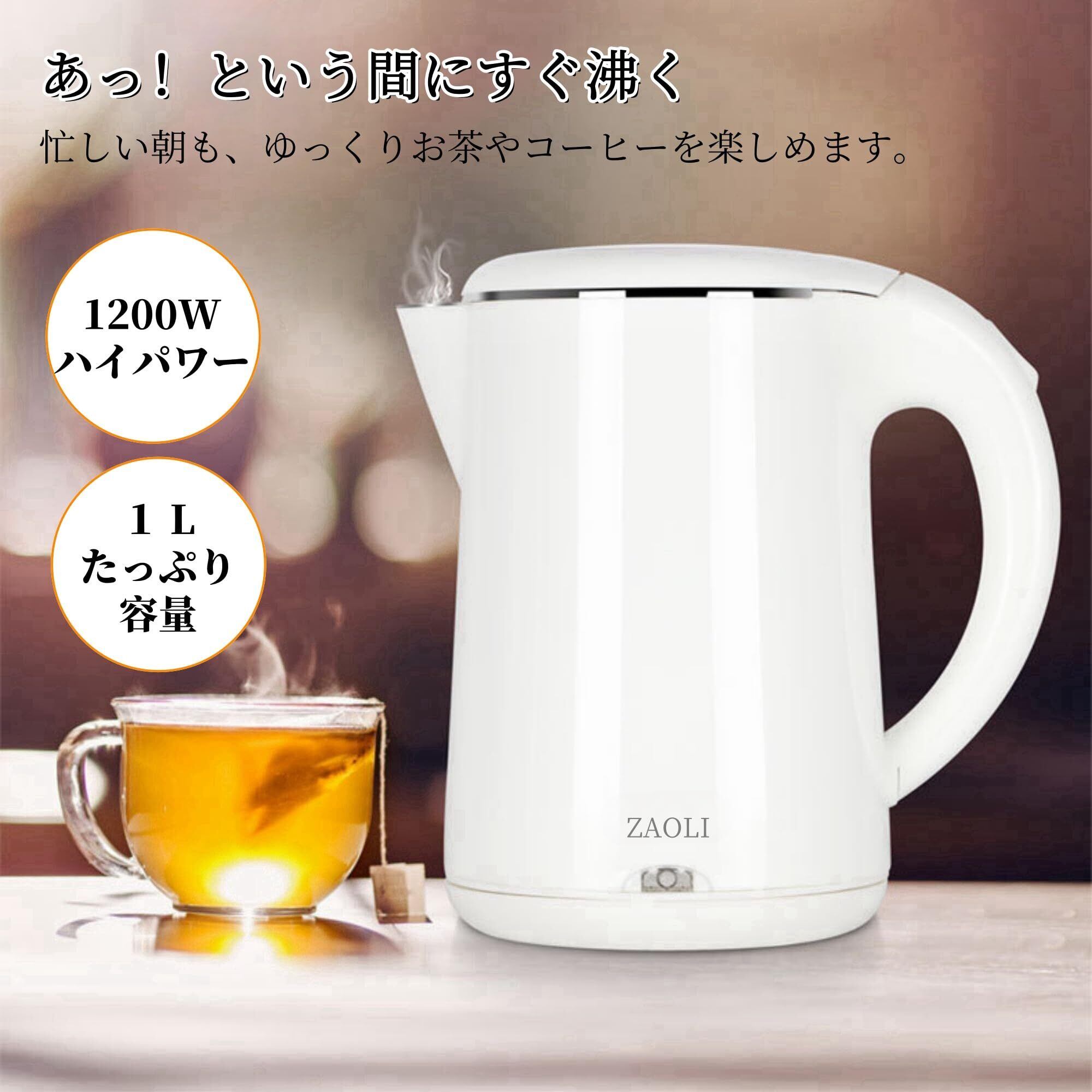 ZAOLI 電気ケトル 小型 1.0L 1200W ハイパワー ステンレス内側 おしゃれ 空焚き防止 自動電源OFF 二重構造 触れても熱くない お手入れ簡単 PSE認証済み【1年間品質】 ZL-K10-P ホワイト