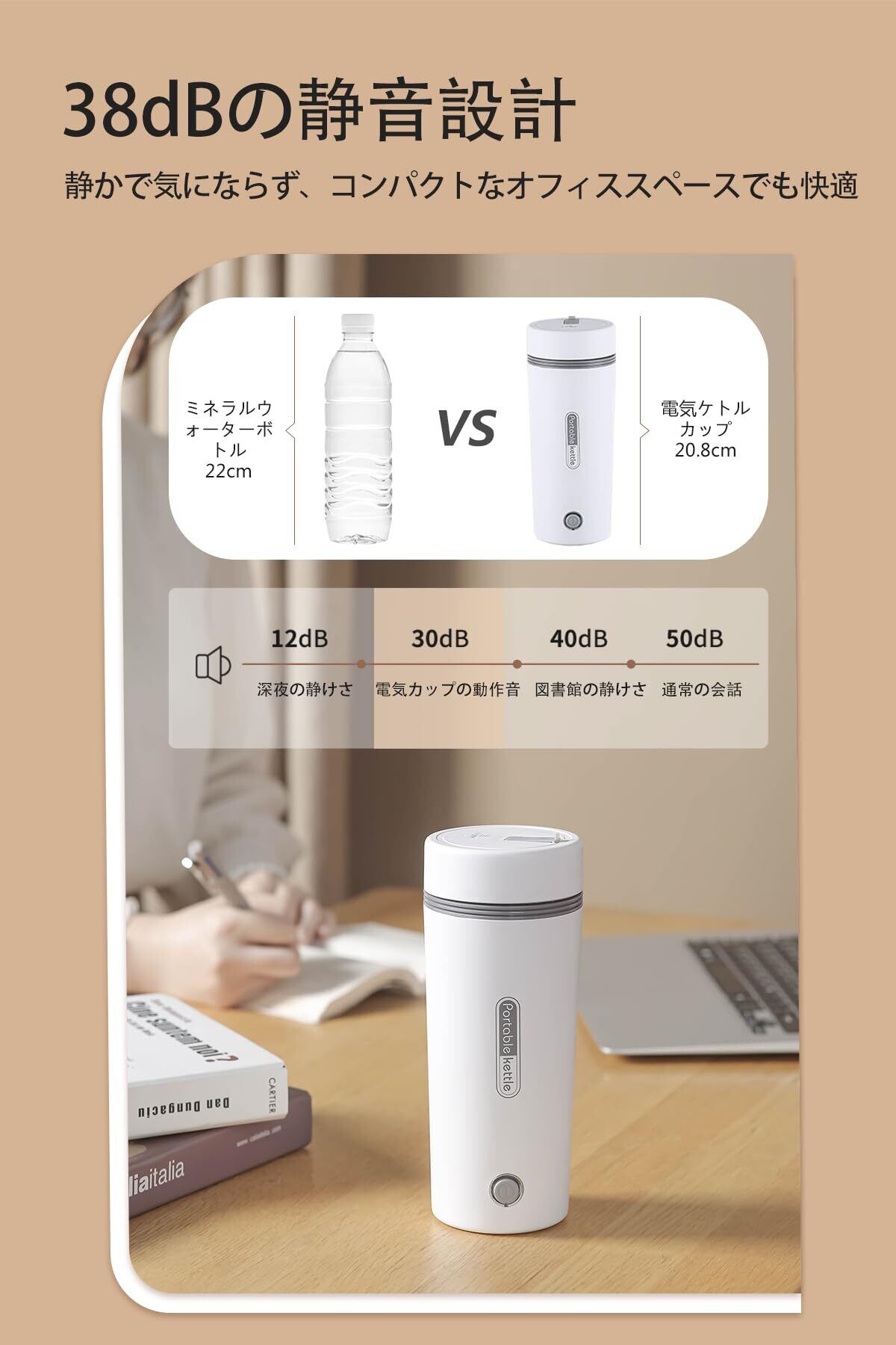 【高品質素材&静音設計】 この電気ケトル 小型は、食品グレードの304ステンレス製内壁を採用し、耐腐食性・耐熱性に優れています。熱湯を安全に飲むことができ、お手入れも簡単で長く使用できます。中間には真空断熱層を備え、保温効果も抜群。外側は高温に強いポリゴン型のプラスチックカバーを使用し、滑りにくく持ちやすい設計です。また、電気ケトル 小型は38dBの静音設計で、オフィスや図書館などの静かな環境でも快適に使用できます。