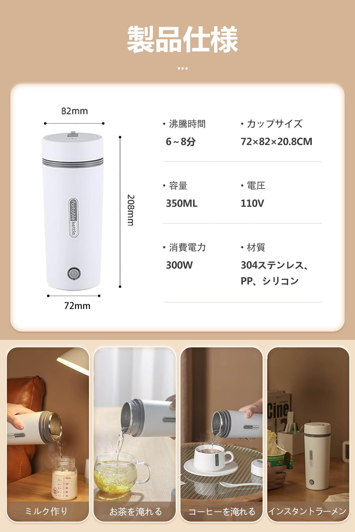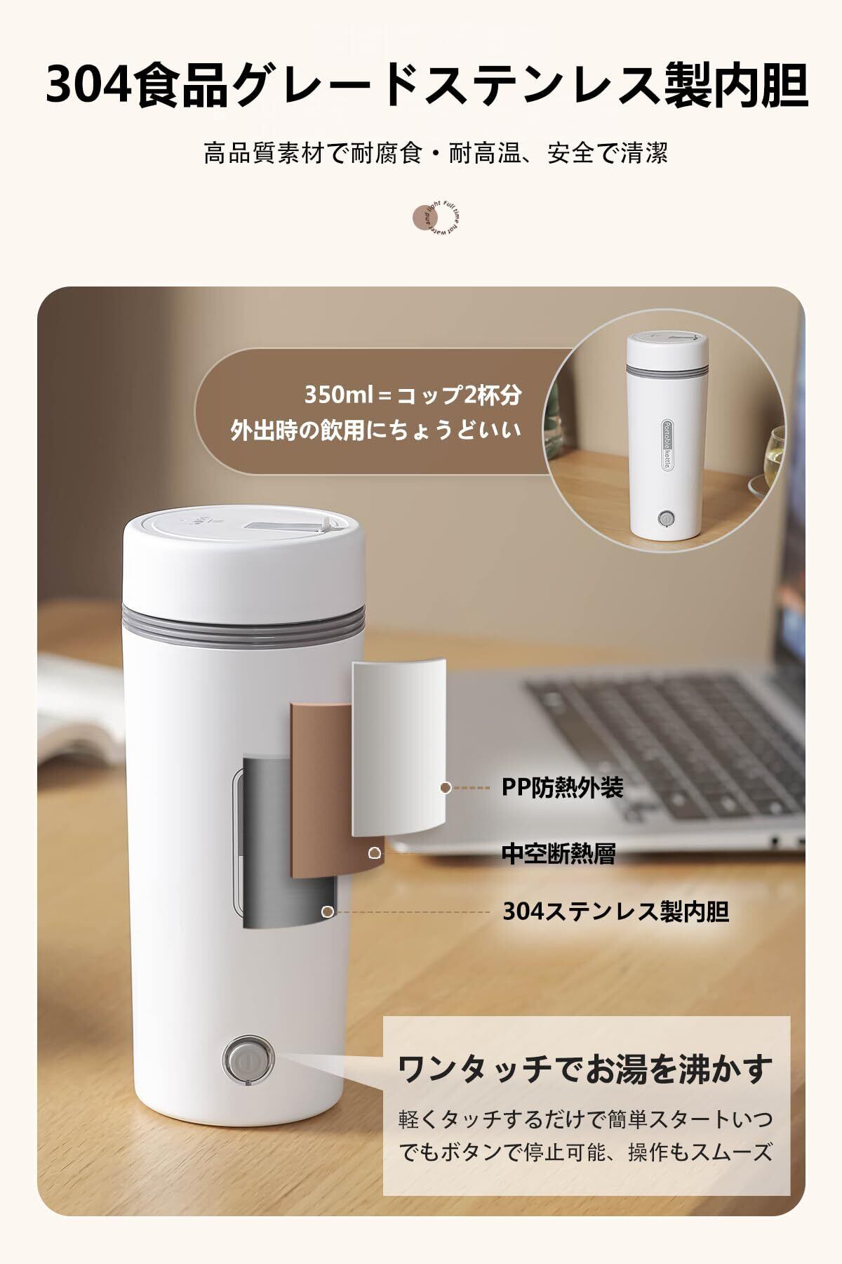 電気ケトル 小型 電気ポット 小型350ML 旅行 急速沸かし 空焚き防止 真空断熱 漏れない 水筒 電気ポット 電気温水カップ ステンレス コーヒー 紅茶に使用 保温ポット 一人用 ホワイト