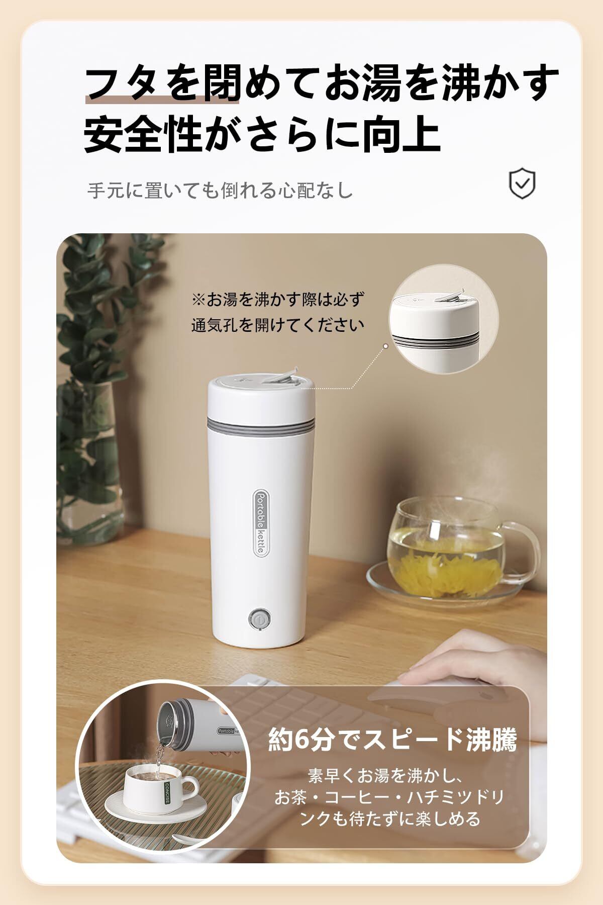 【多重安全設計】この電気ケトル 小型は、お湯が沸騰すると自動で電源が切れるため、安心して使用できます。フタを閉めたまま加熱できるため、安全性がさらに向上し、手元に置いても倒れる心配がありません。 【※安全注意】お湯が沸騰した後は、2分ほど静置してからフタを開けてください。やけどの恐れがあります。また、標高1000m以上の高地で使用する場合は、必ずフタを開けた状態でお湯を沸かし、水量はカップの2/3以下にしてください。安全に配慮した電気ケトル 小型で、安心してお使いいただけます。