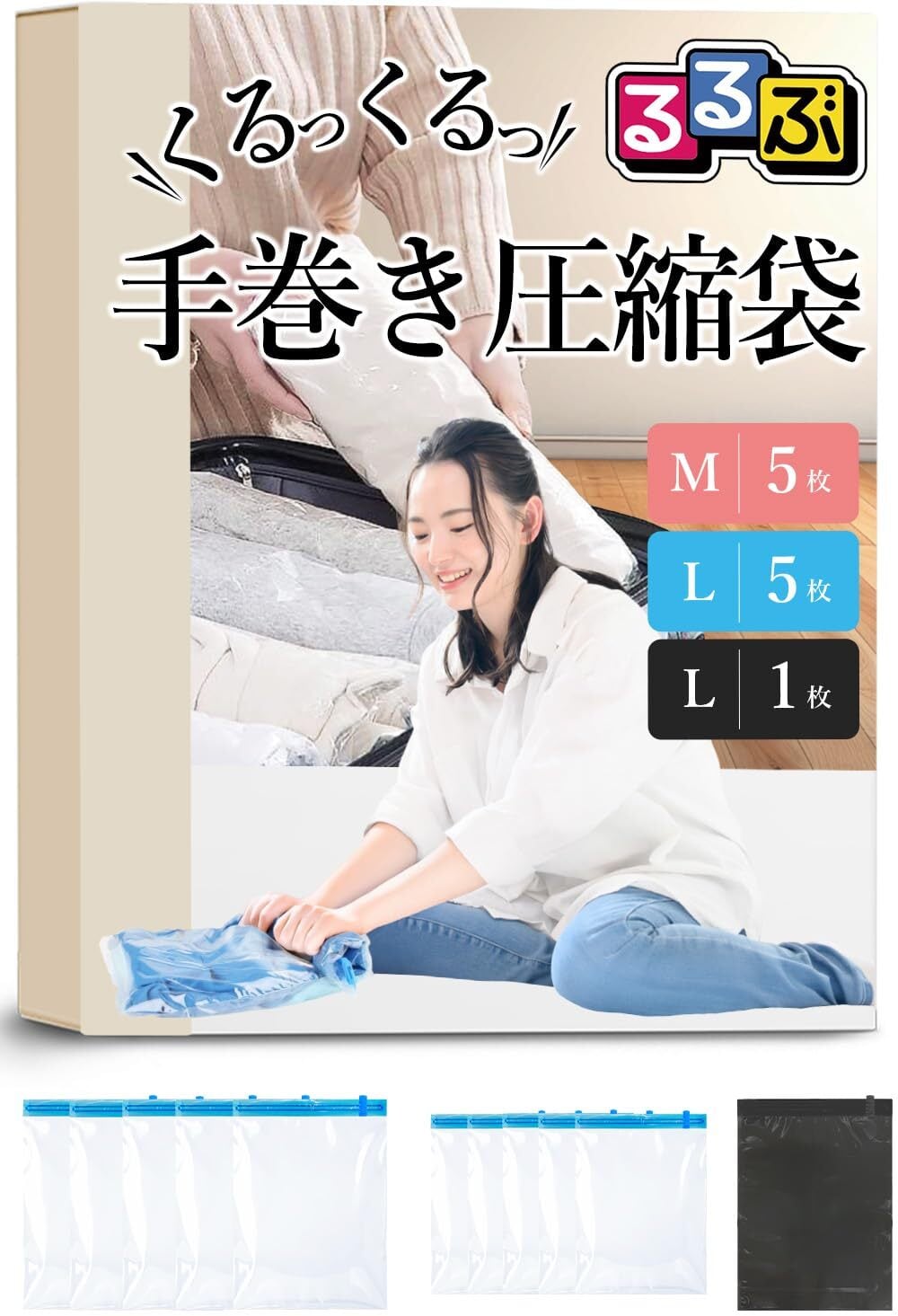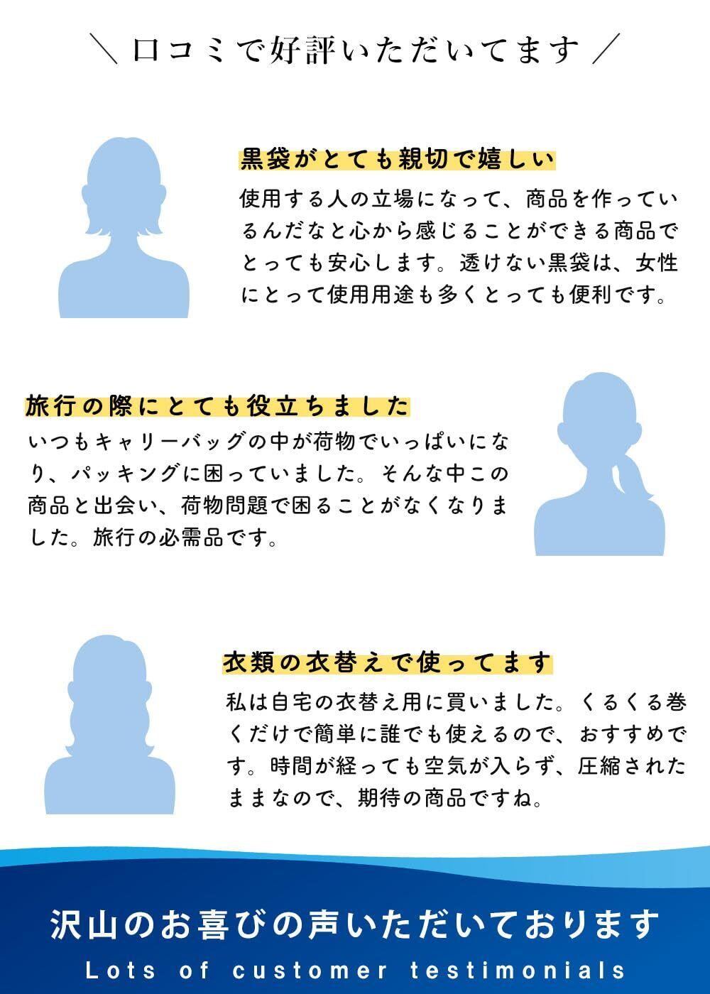 【くるっと簡単 " 手巻きタイプ "】旅行に便利な厚手の洋服(Mサイズ)からダウン(XL)までのサイズをラインナップ。見られたくない下着類を圧縮するのに便利な " 透けない黒色袋 " が全サイズに付属!