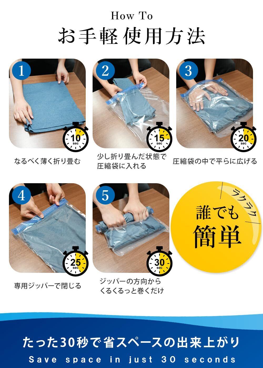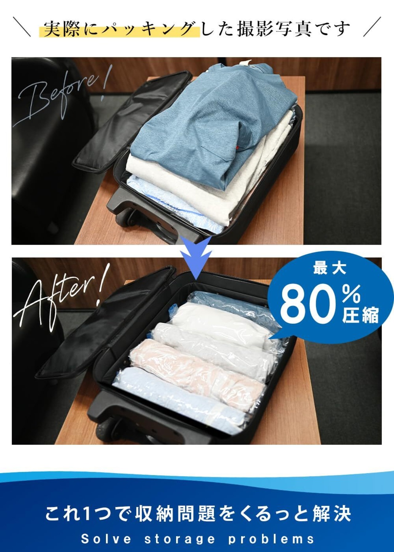 【整理整頓のプロ監修】1級整理収納アドバイザーでもありSNSフォロワー数34万人越えのakiさん監修。プロ監修の圧縮袋は、旅行中におけるストレスを極限まで減らしスマートな便利グッズに仕上がりました。旅行用圧縮袋や衣替え時の衣類圧縮袋としてもご使用いただけます。