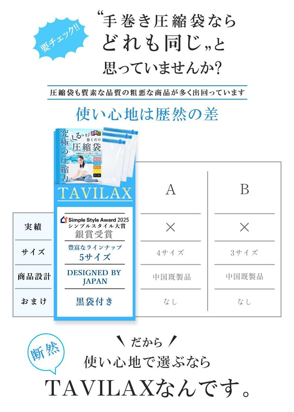 【数量限定】TAVILAX【るるぶ掲載&1級整理収納アドバイザー監修】 圧縮袋 旅行用 衣類圧縮袋 便利グッズ ふとん収納袋 真空パック