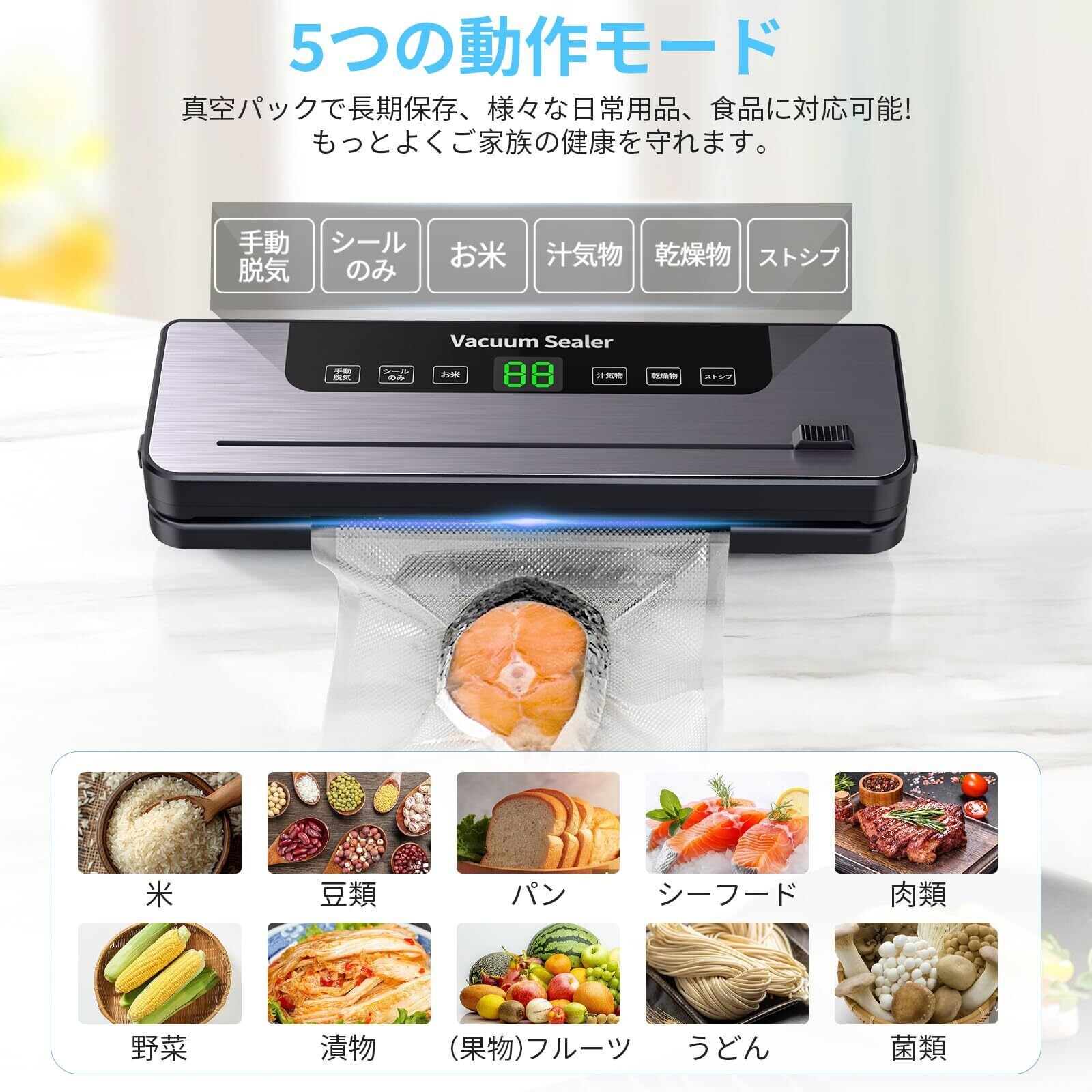 【90kpaの強力な吸引力&様々な食品に対応可能】真空パック機は先進的な真空技術が採用され、吸引力は最大約90kpaに達し、短時間で真空にすることができます。これには手動脱気、シールのみ、お米、汁物、乾物(ドライ物)の5つのモードが搭載されています。肉類、魚、野菜、果物などの食品の新鮮さを保つことができ、お菓子、ナッツなどの乾食品(ドライ食品)の真空保存にも使用できます。湿気や埃を効果的に隔離し、食品の酸化や細菌の繁殖を防ぎ、食品の栄養と新鮮さを長期間保つことができます。君とご家族により健康で高品質な生活をもたらします。 <br> <br>※本製品には10個の真空パックが付属しています!
