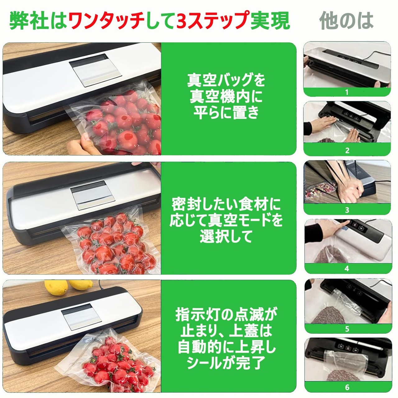 ✨「5つの真空モード」: ドライモード - 穀物やナッツに適しています。モイストモード - 肉、魚介類、果物、野菜の保存に適しています。シールモード - ポテトチップスバッグやスナックバッグに適しています。手動モード - 柔らかく壊れやすい食品の保存に適しています。外部真空モード - 瓶、キャニスター、ワインボトルに適しています。