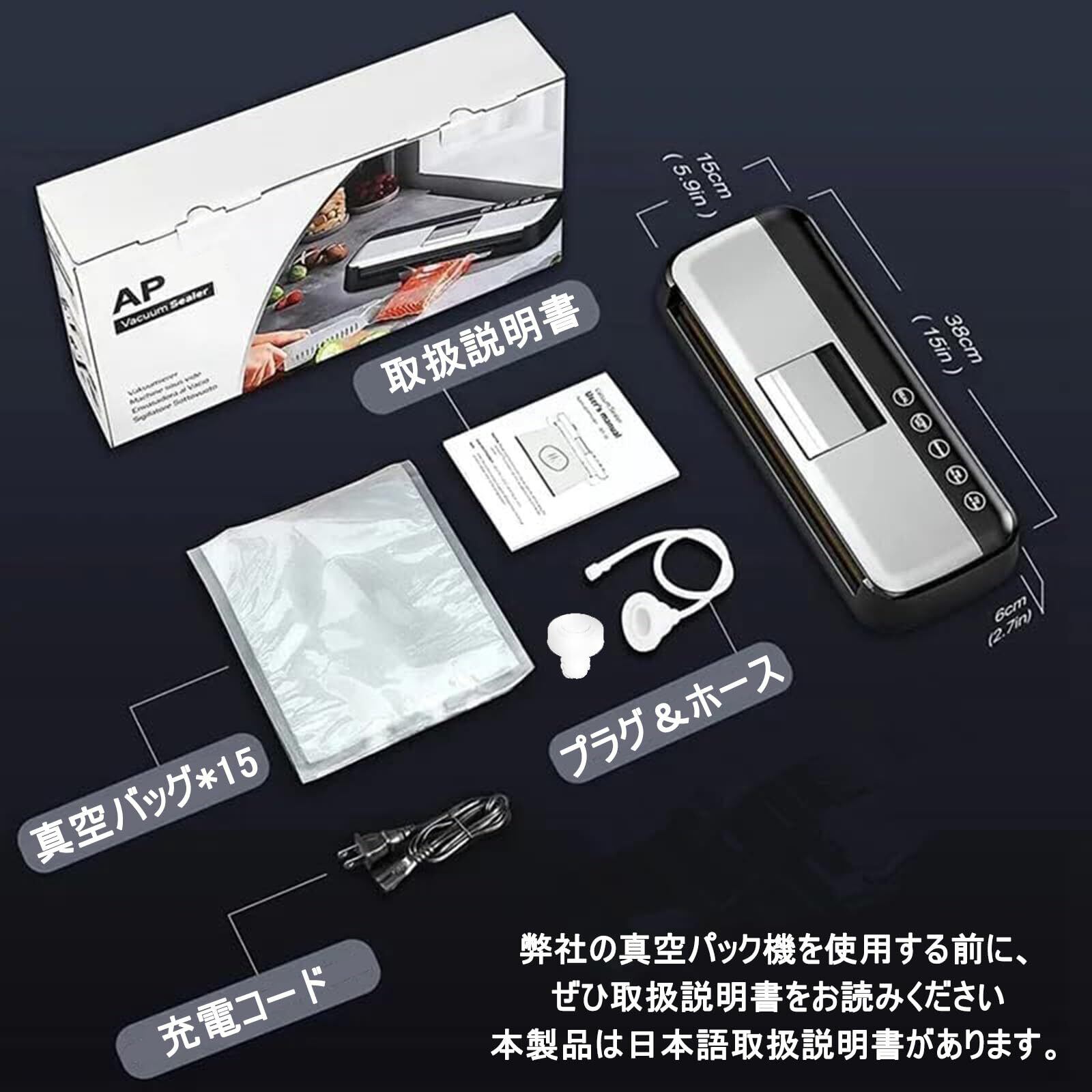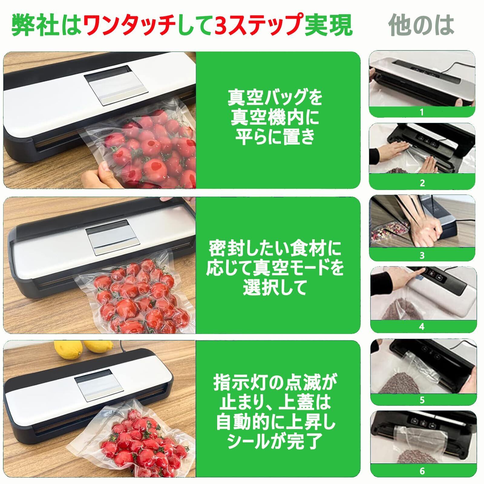 ✨「パッケージ内容」: フードシーラー *1;真空バッグ *15 個 (7.8 インチ x 9.85 インチ) (バッグはBPAフリーで真空調理に使用できます);空気吸引ホース&プラグ;日本語&英語ユーザーマニュアル。