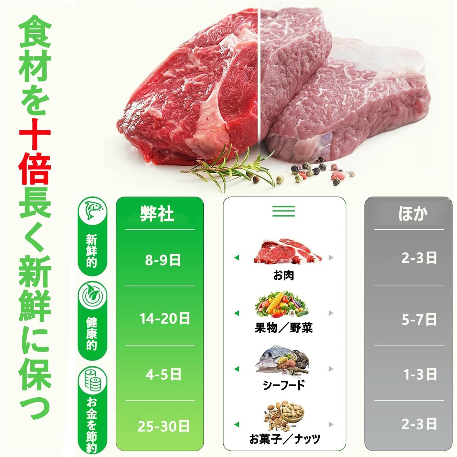 ✨「食品を新鮮に保ち」:フードシーラーは、食品の真空シールを完了するのにわずか5〜8秒しかかかりません。通常の保存方法よりも10倍長く食品を新鮮に保ちます。様々な食材・余った食材も保存できるから、冷凍庫・冷蔵庫を素早くスッキリ整頓。忙しい毎日の中で、手間を省くことを確信する。