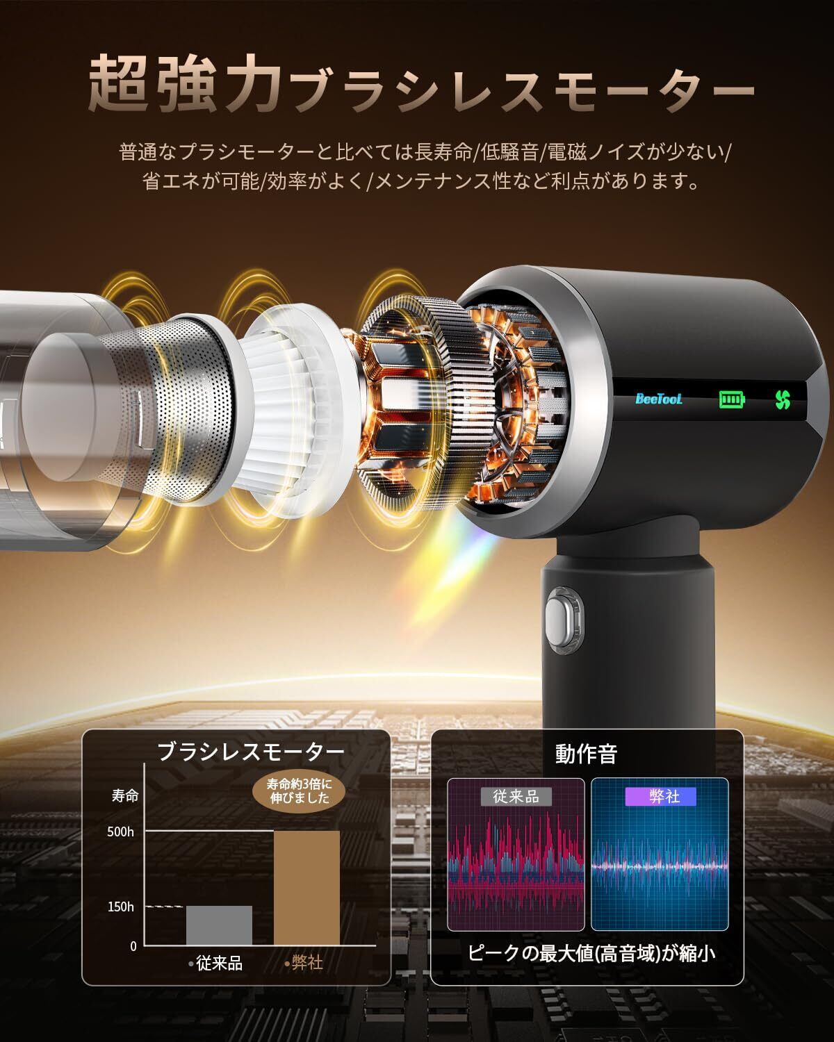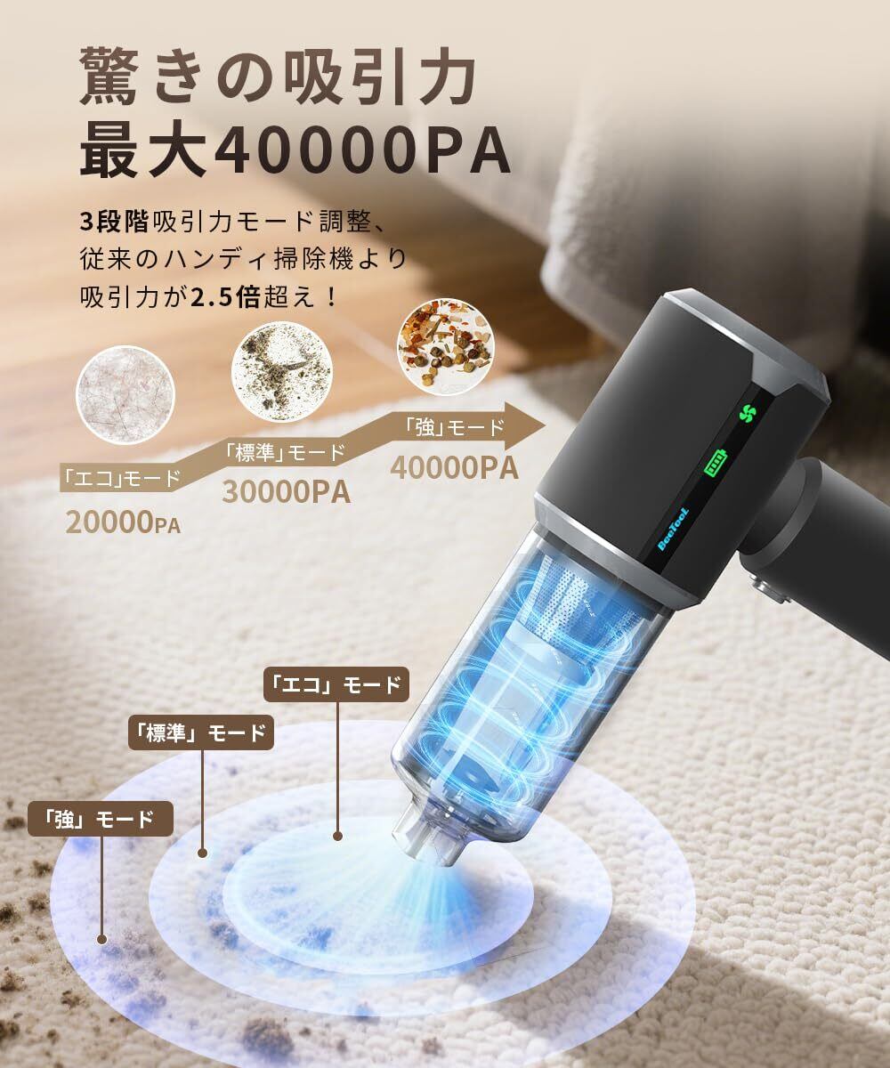 【新開発!!LEDディスプレイ!!驚きの40KPa吸引力!3段階吸引力】BeeToolハンディクリーナーは先進的LEDディスプレイを搭載し、吸引力のレベルやバッテリー残量、充電状況などを一目で確認でき、より効率的な掃除をサポート。このハンディクリーナーは省エネ、長寿命、低騒音、小型・軽量の特長を持つブラシレスモーターを採用し、吸引力が40KPaに達し、従来の掃除機より55%アップ!一度でしっかり吸い取り効率的なお掃除を実現します。このハンディ掃除機はワンタッチでエコ・標準・強力3段階吸引モードを簡単に切り替えられ、より快適な使用体験をもたらします。
