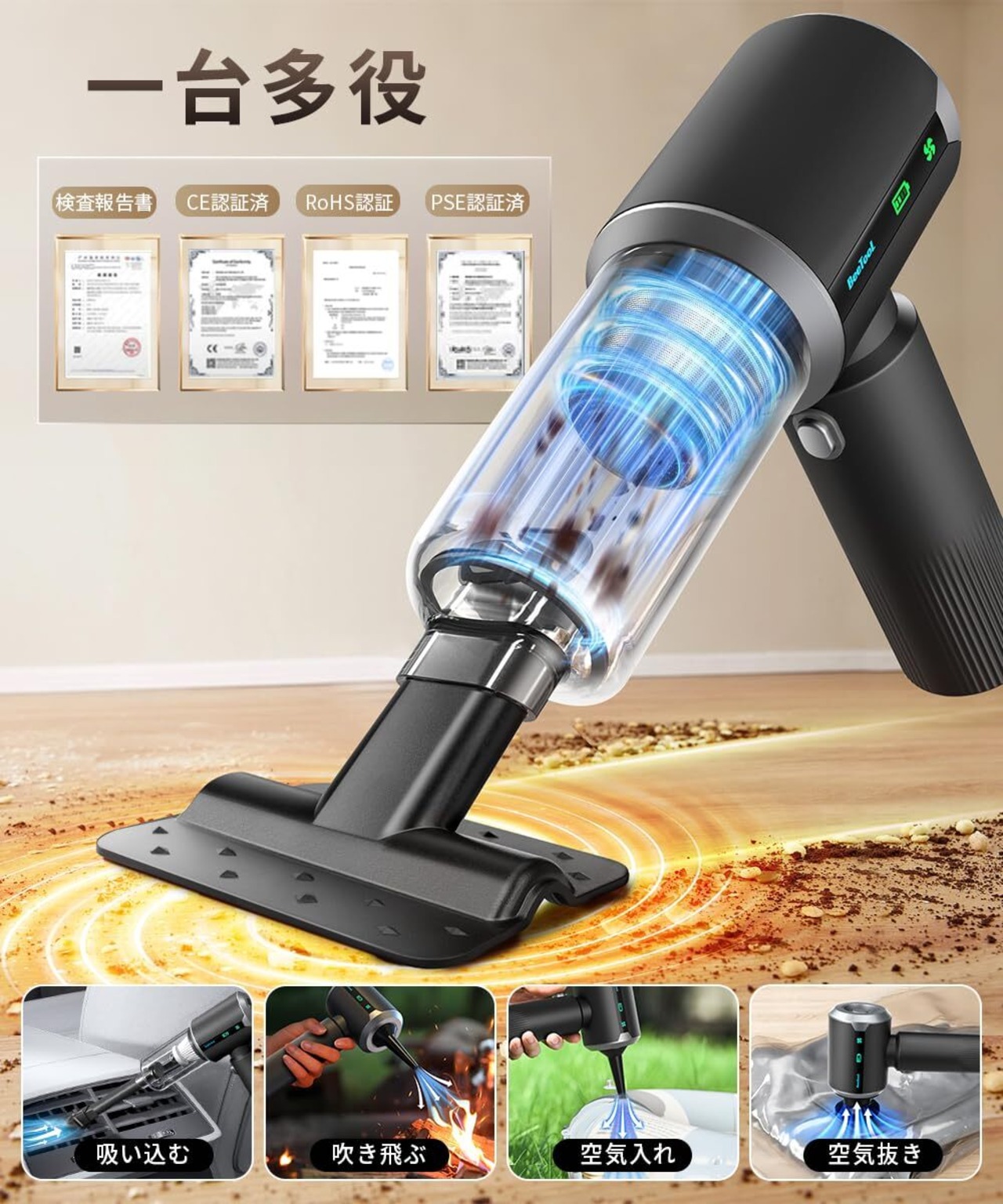 【一台多役!多様なアタッチメント付き!巾着袋付き!】 吹き飛ぶ 吸い込む 空気入れ 空気抜き。このハンディクリーナーはミニ掃除機/エアダスター/電動エアーポンプとして利用可能です。ソファの隙間、キーボード、車内掃除、ネックピロー、エアベッド、エアボート、専用衣類圧縮袋などに使用可能です。7種の交換用アタッチメントを備えて、ゴミの取り残しを軽減し、掃除の効率を高めます。車内/自宅兼用のハンディ掃除機です。Lサイズの巾着袋付き、小型掃除機とアタッチメントなどのを保管することができます。探すのに時間がかかったり、どこにあるのか分からない心配も一気に解消されます。